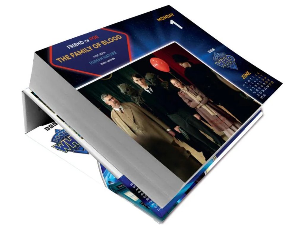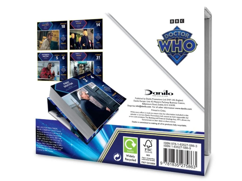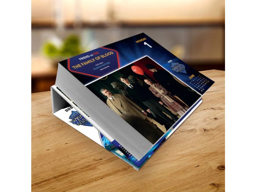 Oficiální produkt - denní stolní trhací kalendář TV stanice BBC na rok 2026 s licencí a fotografiemi hrdinů TV seriálu Doctor Who.