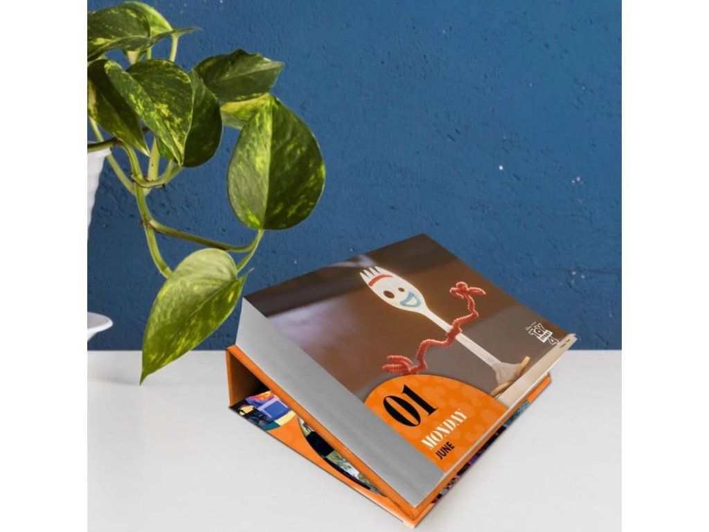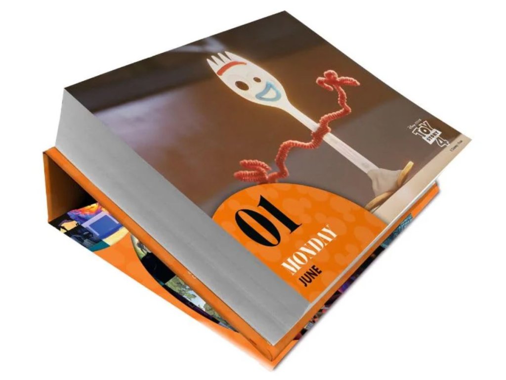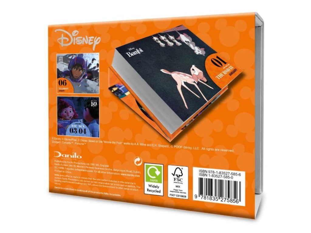 Denní stolní trhací kalendář formátu 15 x 13 x 4 cm s celkem 365 obrázky postaviček z dětských animovaných filmů studia Walta Disneyho.