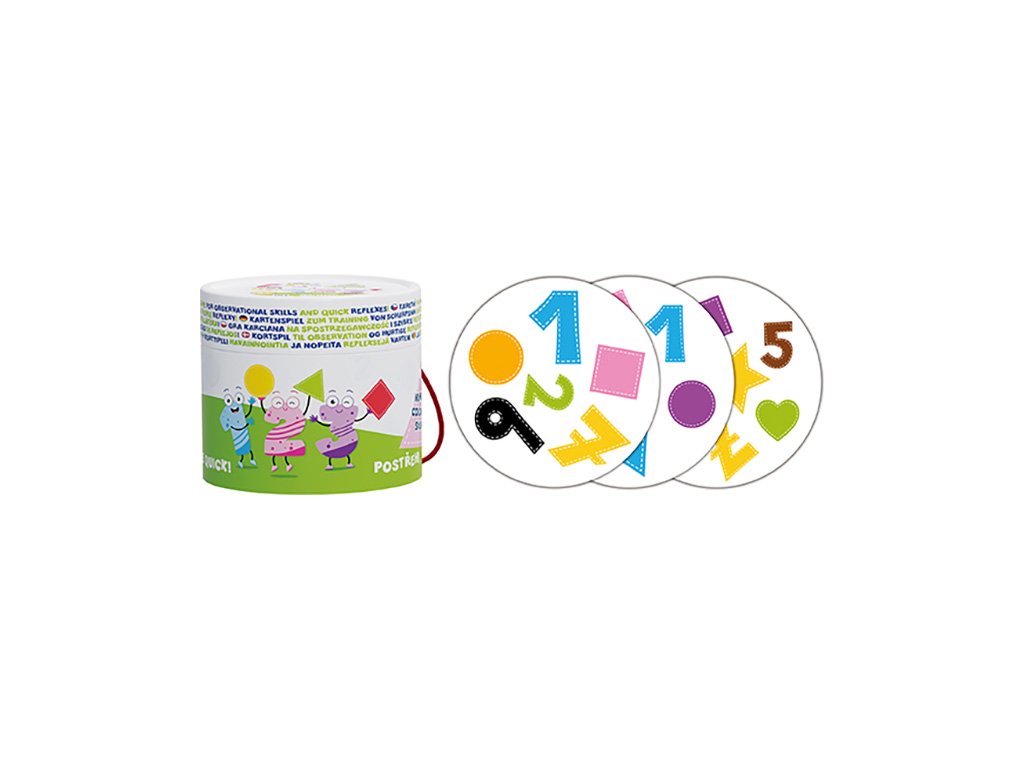 Karetní hra na postřeh a rychlé reflexy obsahuje 30 barevných kartiček s čísly, barvami a tvary pro trénink předškolních dovedností. Součástí balení jsou i pravidla, jak si hru zahrát.