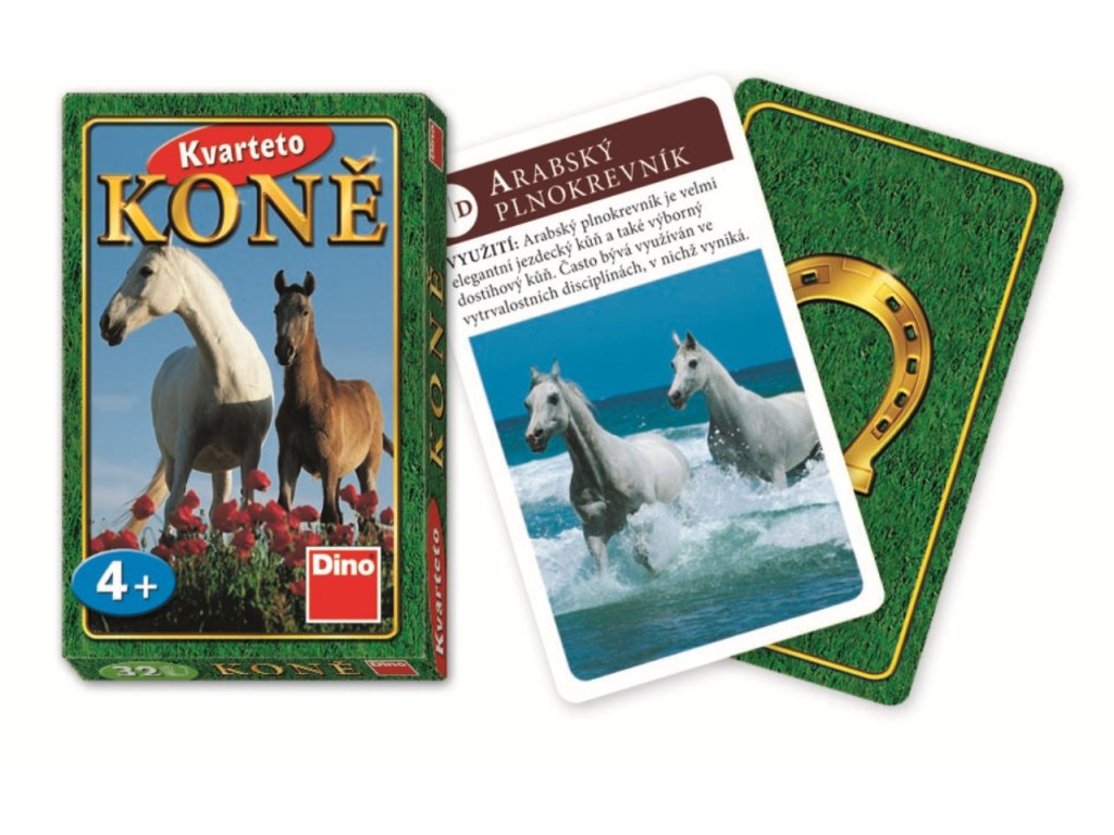 Hrací karty Kvarteto s motivem koní. V papírové krabičce je 32 karet a pravidla. Vhodné pro 3 - 6 hráčů od 4 let.