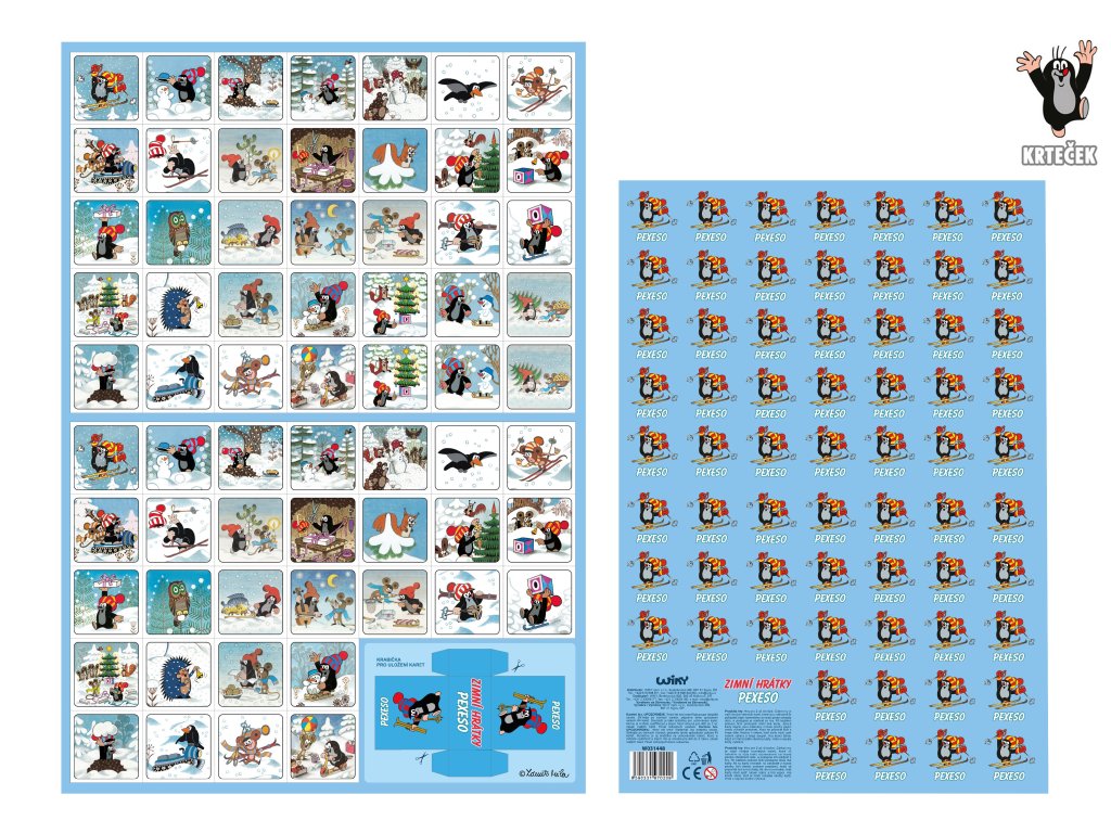 Krtek Pexeso vystřihovací, zimní hrátky. 32 párů. Na archu krabička k vystřižení. Rozměry jednotlivých kartiček 48x48 mm. Papír 400g