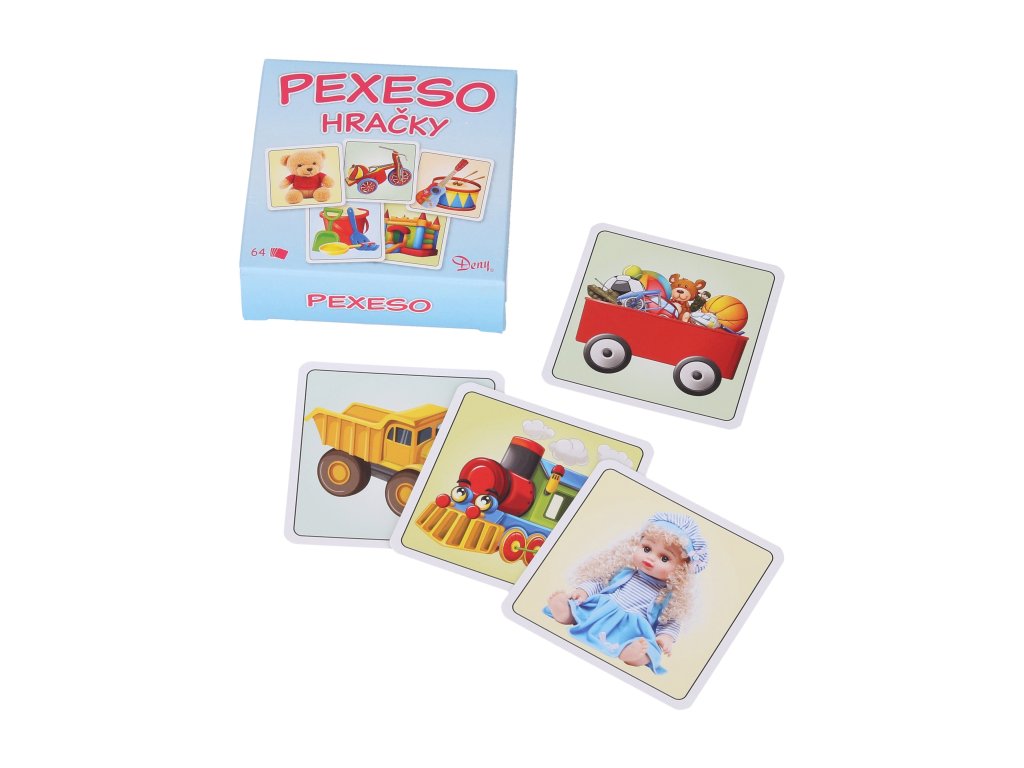 Pexeso Hračky v krabičce. Balení obsahuje 64 karet (32 párů) + 2 karty s pravidly. Rozměr krabičky 8x8x2,5 cm.