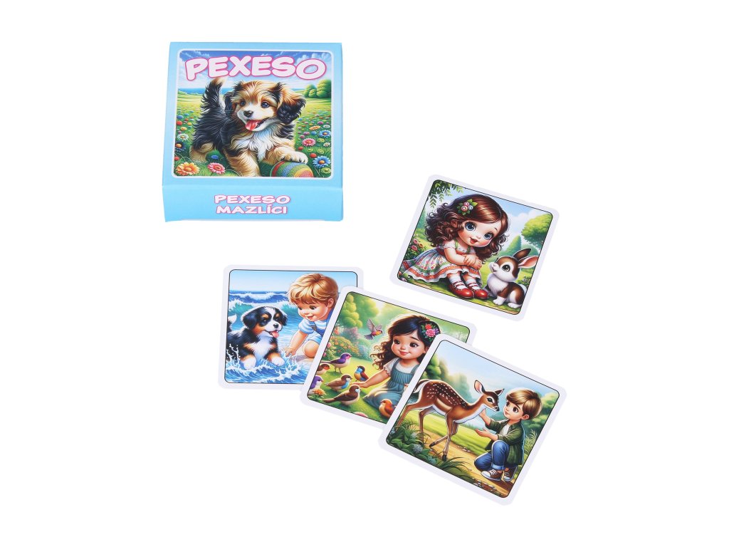 Pexeso Mazlíci v krabičce - modré. Balení obsahuje 64 karet (32 párů) + 2 karty s pravidly. Rozměr krabičky 8x8x2,5 cm.