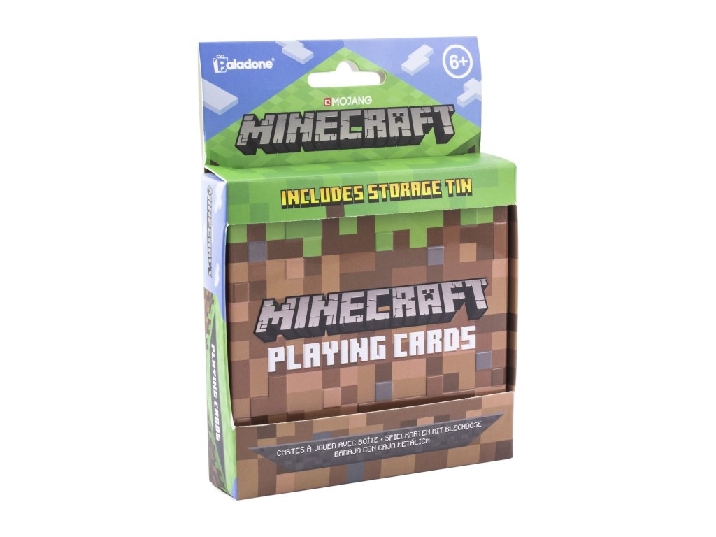 Hrací karty s grafikou počítačové hry Minecraft. Součástí balení je plechová krabička.