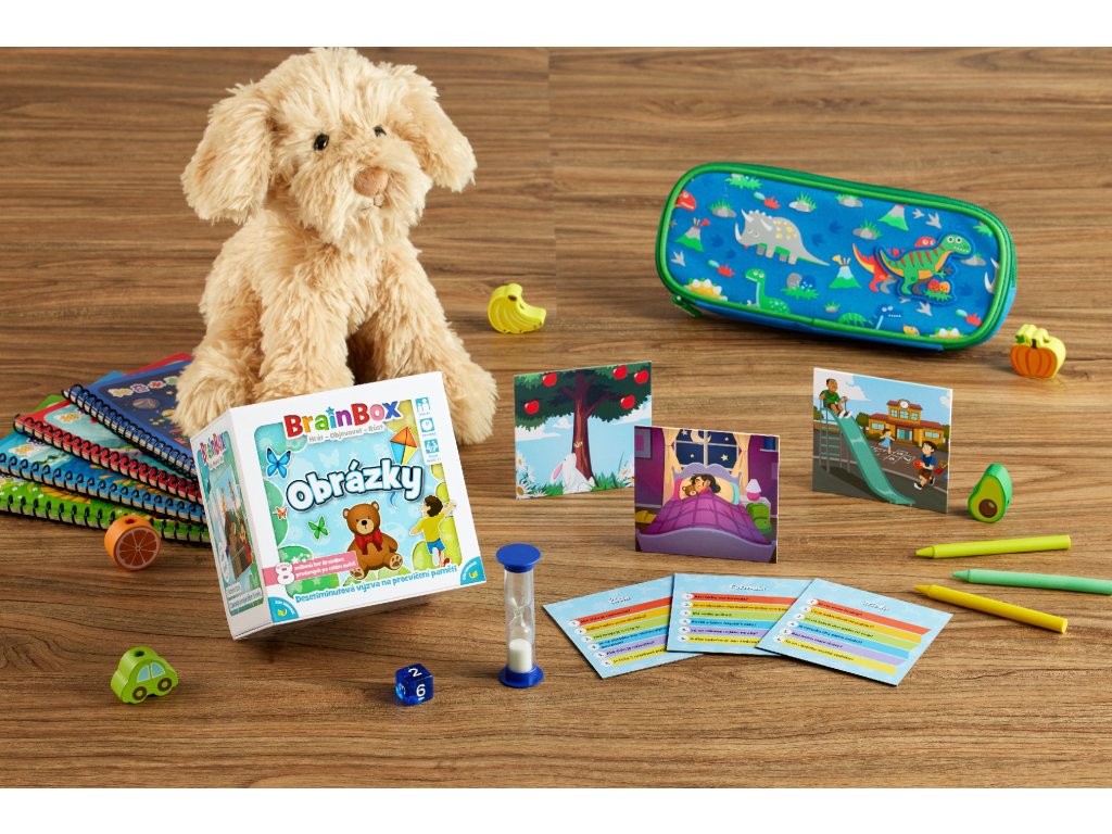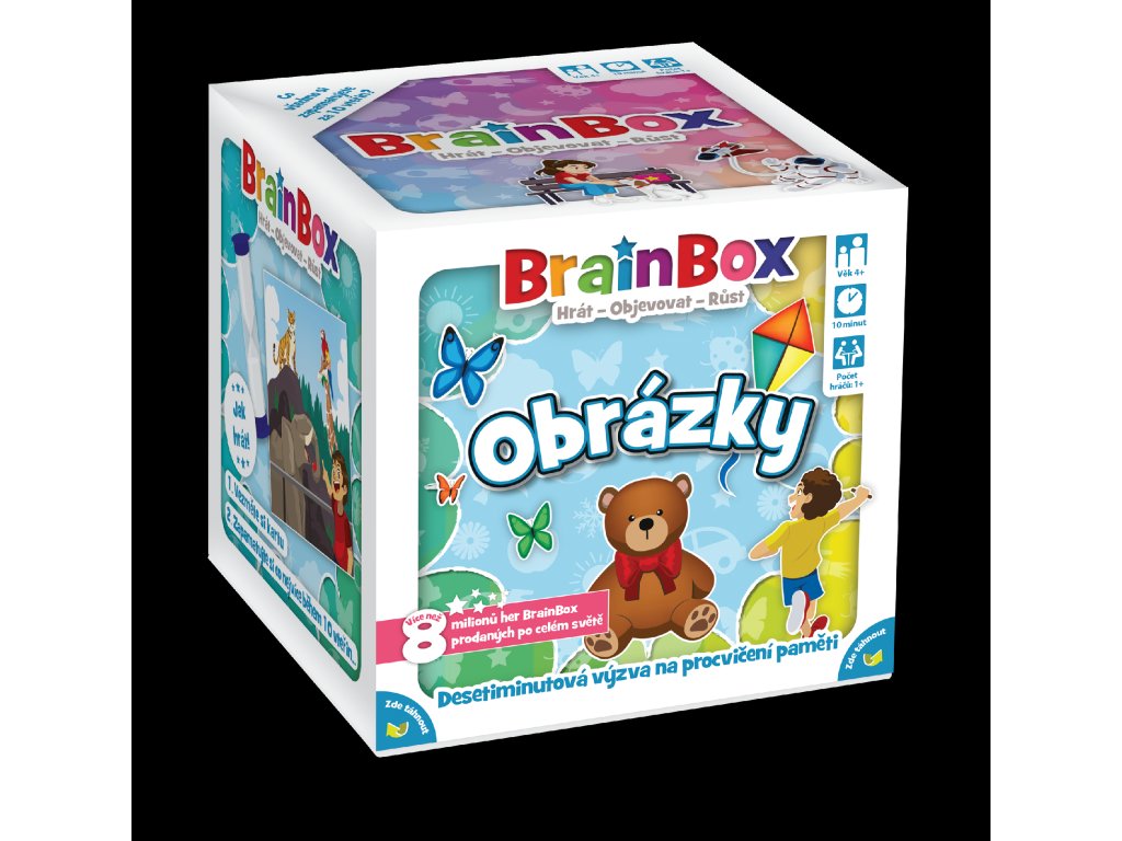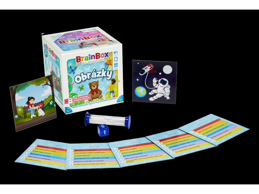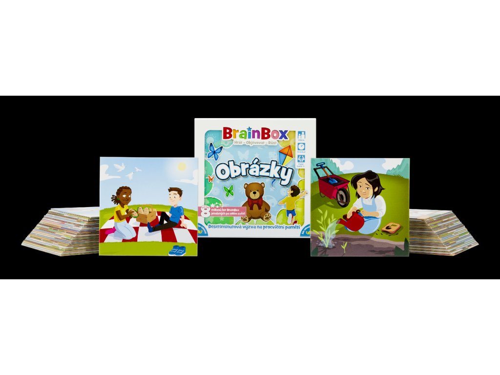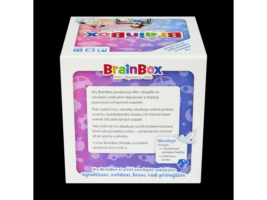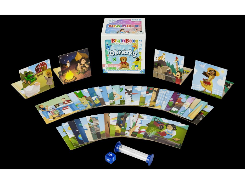 Hra BrainBox Obrázky obsahuje 55 hracích karet s ručně malovanými ilustracemi, které oživují každou scénu, od domácích činností až po sport a přírodu.