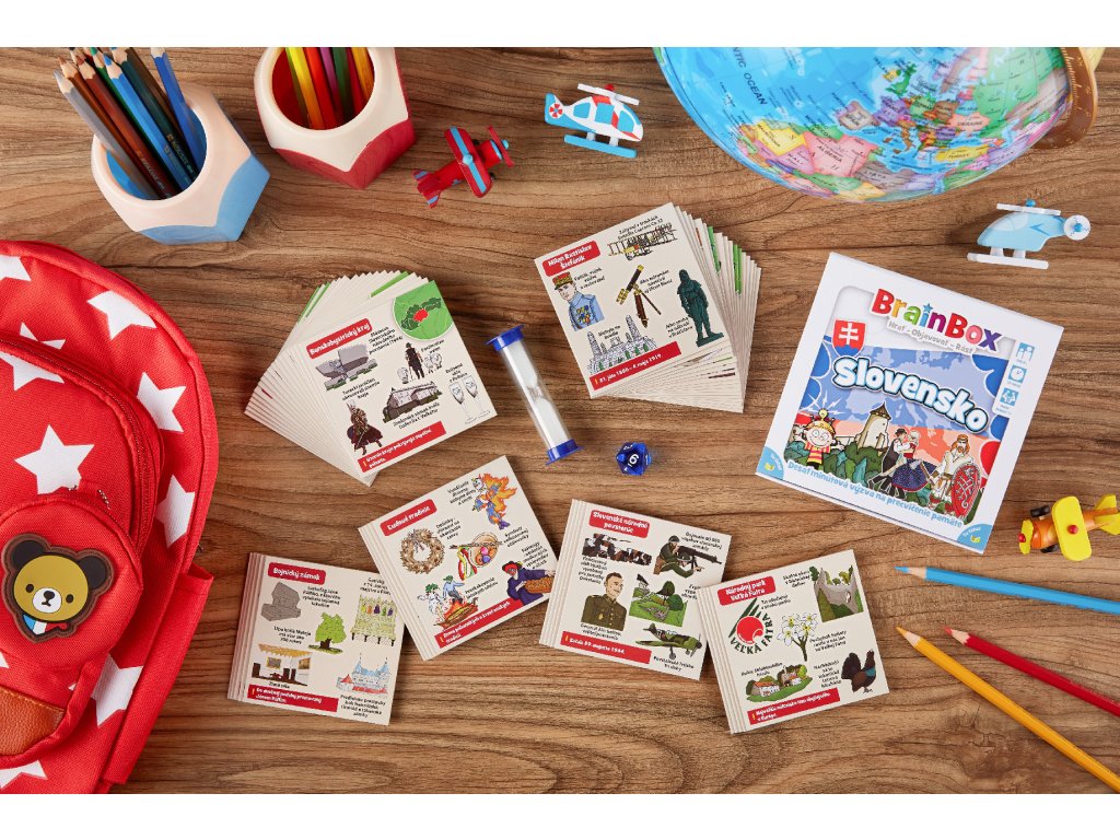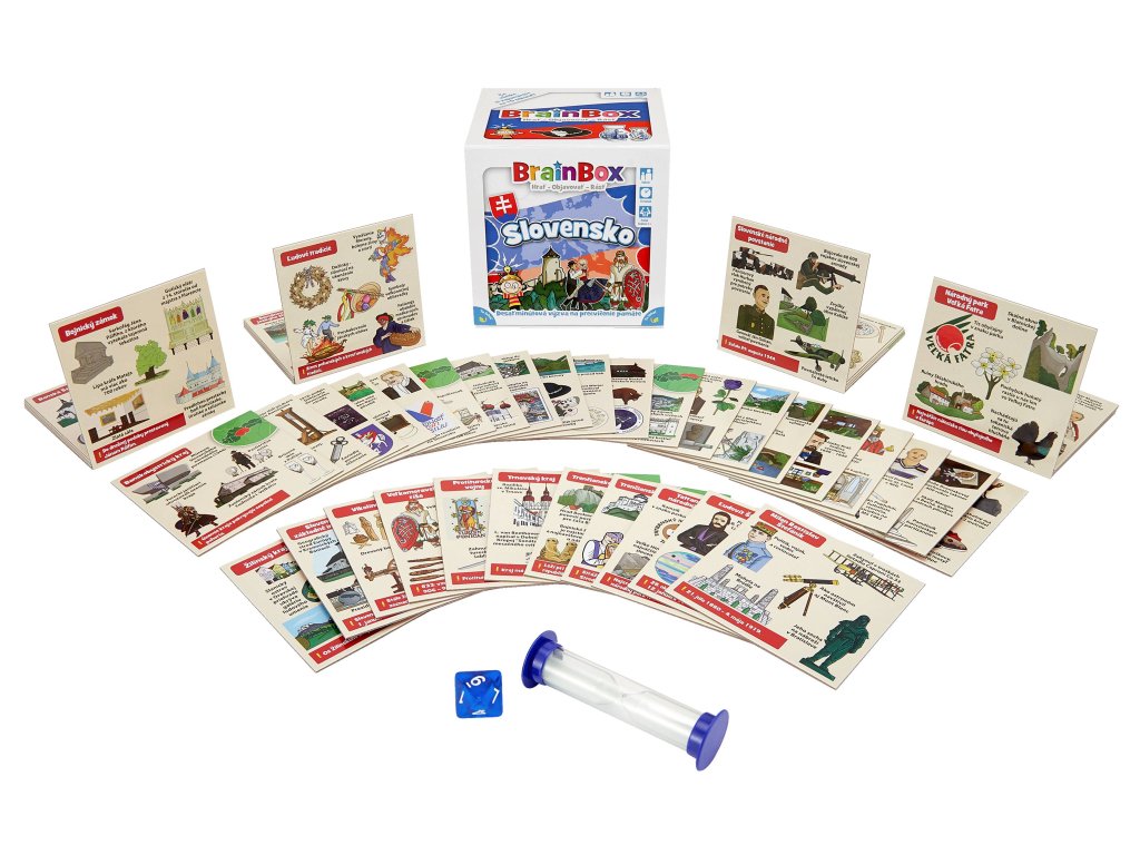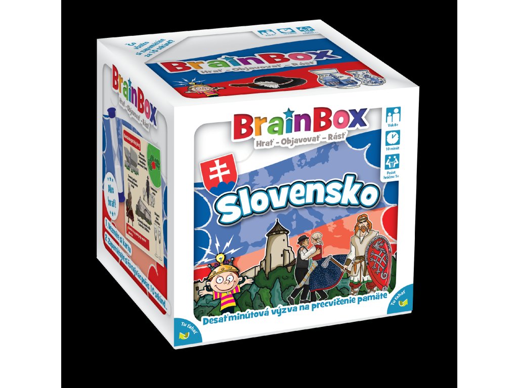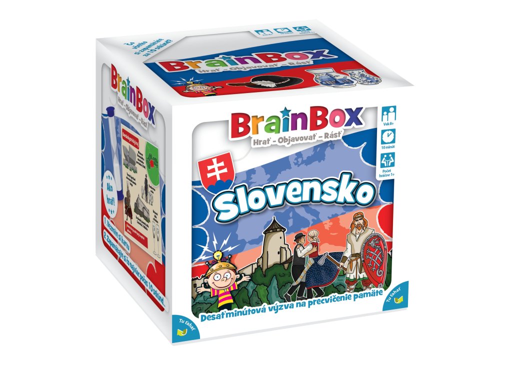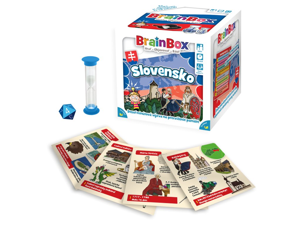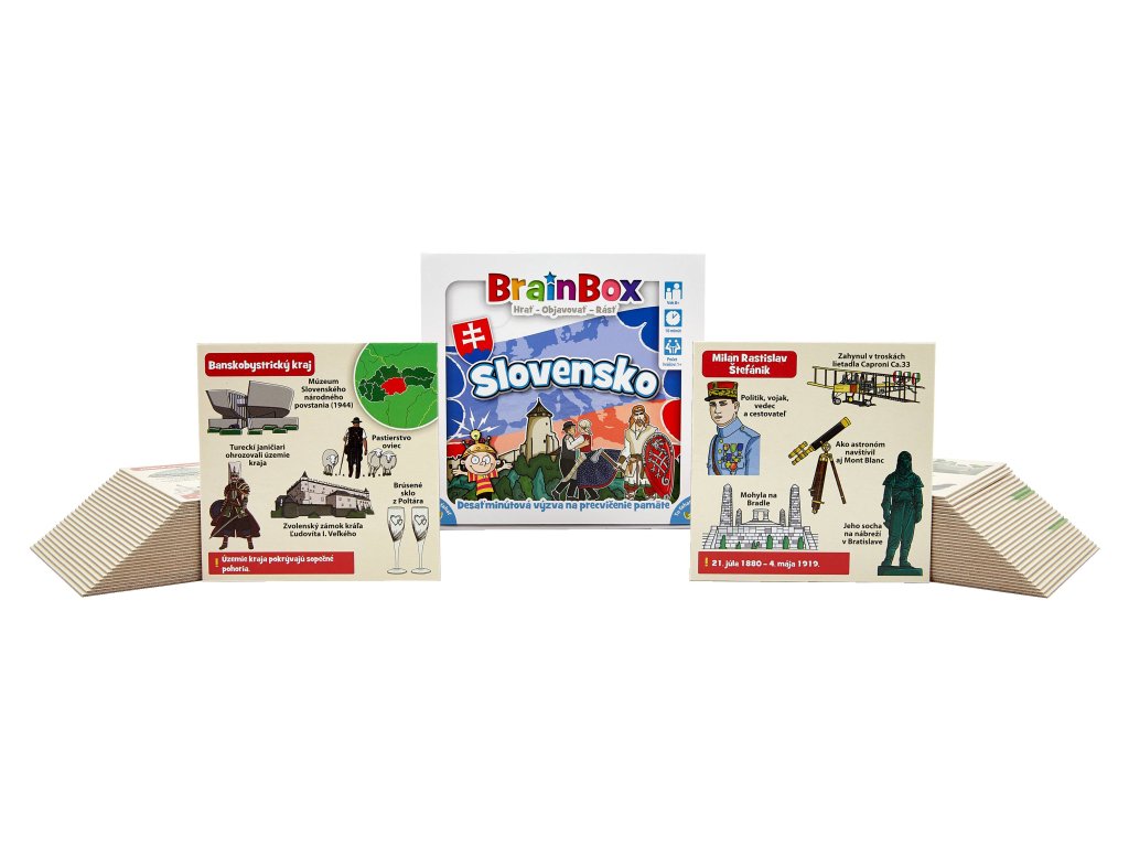 BrainBox Slovensko obsahuje 55 hracích kariet, z ktorých každá reprezentuje iné miesto, okres, osobu alebo okamih z minulosti alebo súčasnosti Slovenska. Karty sú ručne ilustrované, výjavy na nich sú ako skutočné a sú doplnené o významné skutočnosti súvisiace s daným okamihom v dejinách Slovenska.