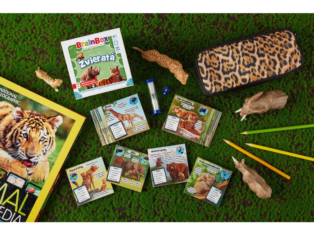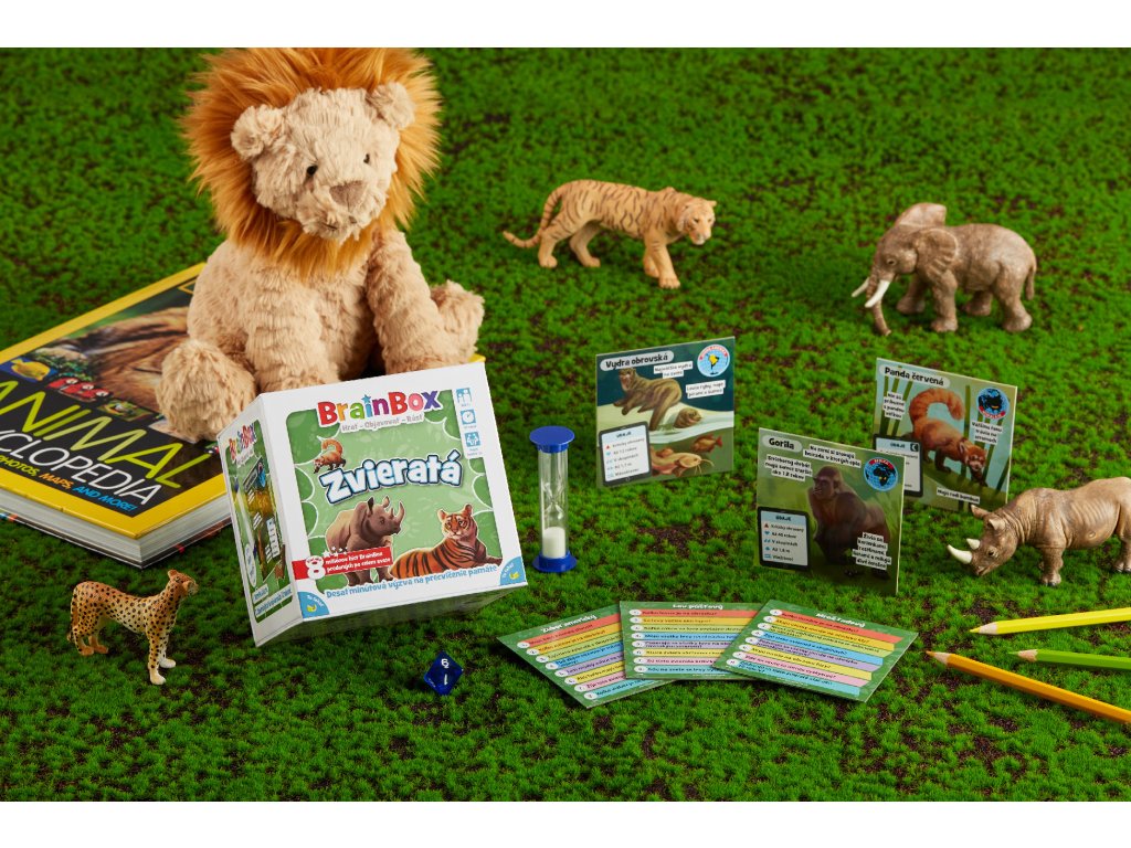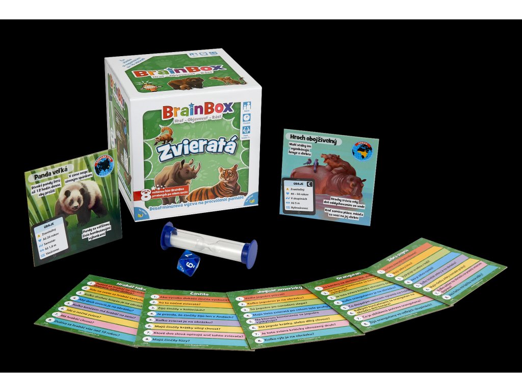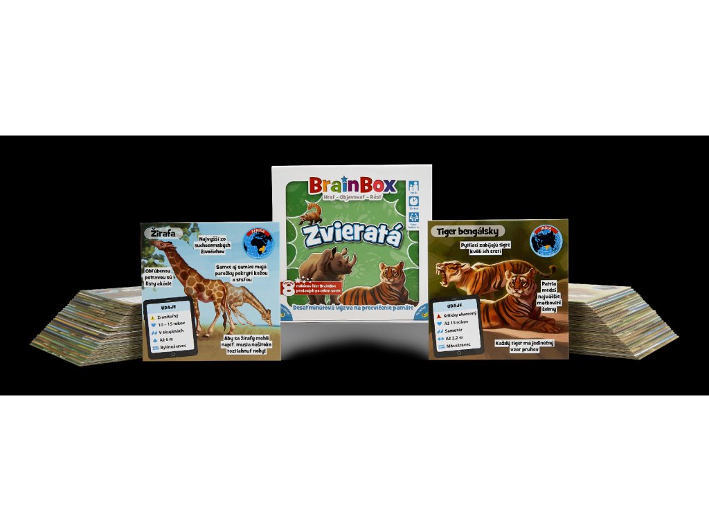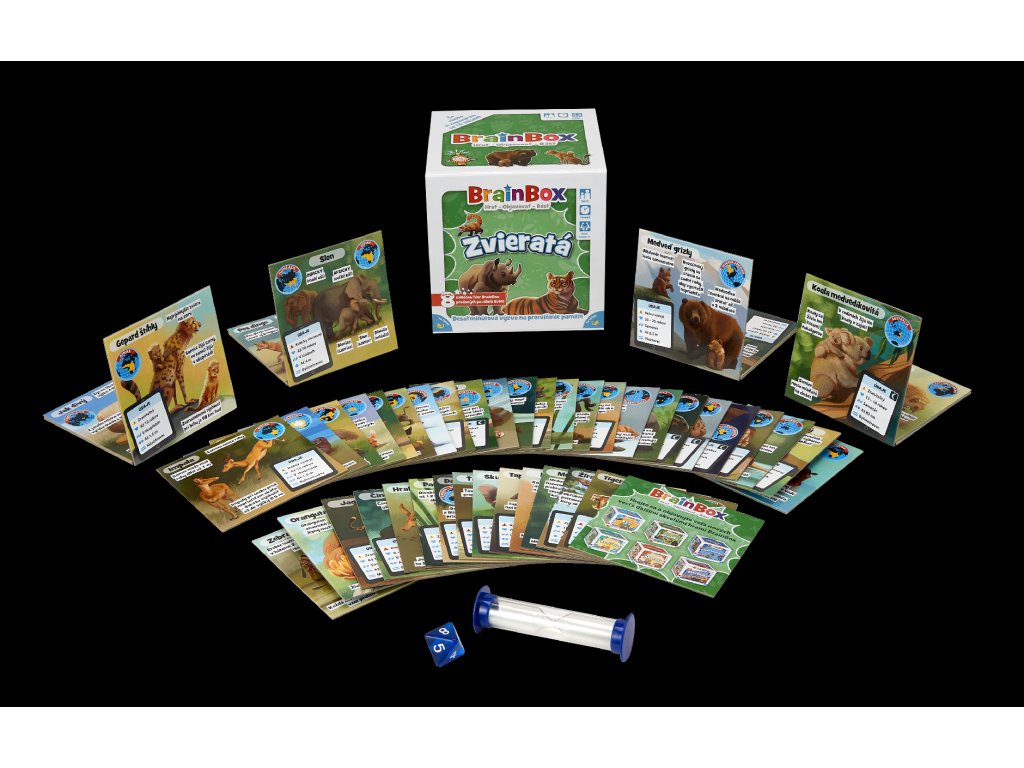 BrainBox Zvieratá obsahuje 54 hracích kariet, z ktorých každá predstavuje iného zástupcu ríše zvierat od polárnych medveďov po pumy, od tapírov po tigre a mnohé ďalšie. Na každej karte je uvedený samostatný živočíšny druh s podrobnosťami o tom, kde a ako žije, s ručne maľovanými obrázkami, ktoré všetko doslova oživia.