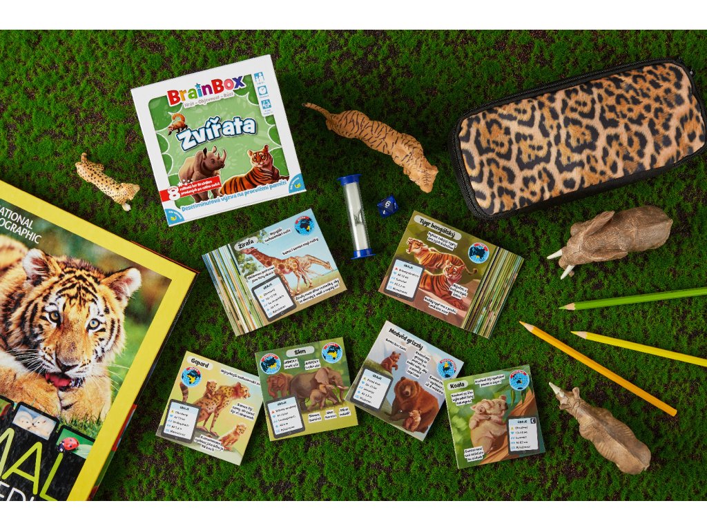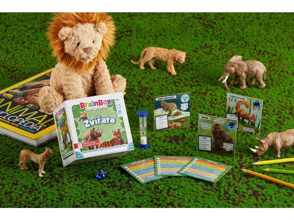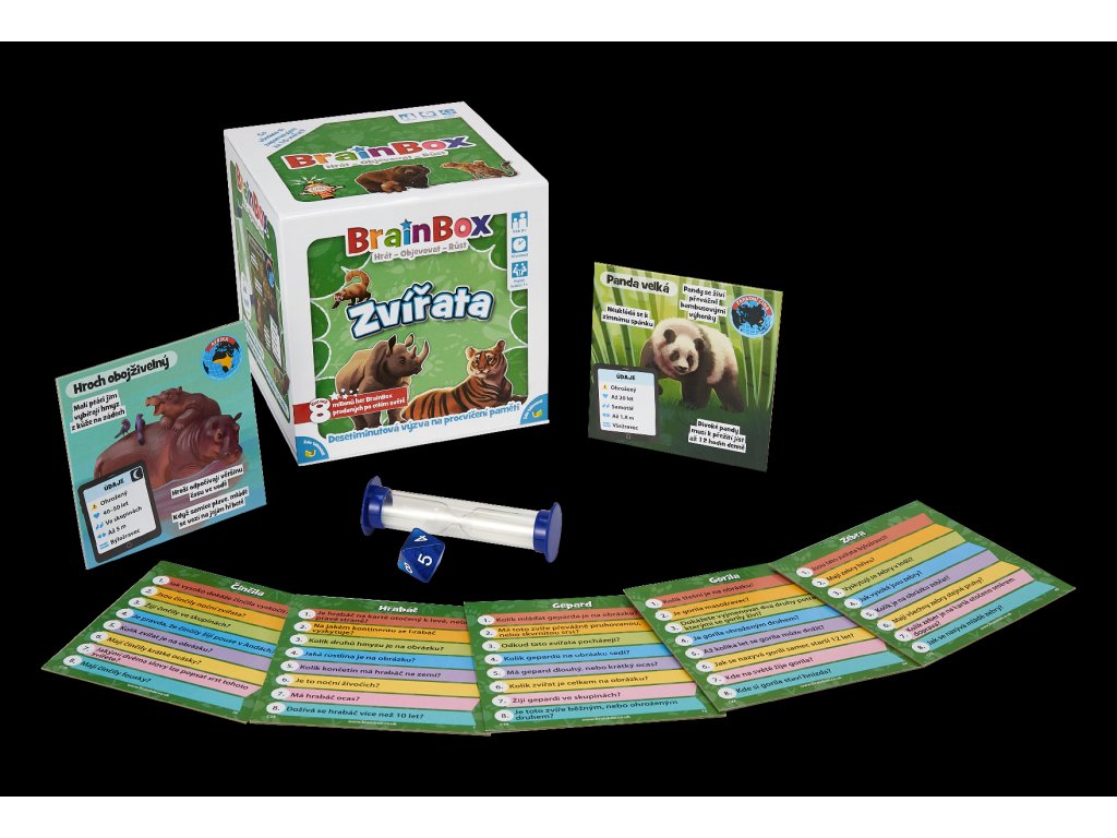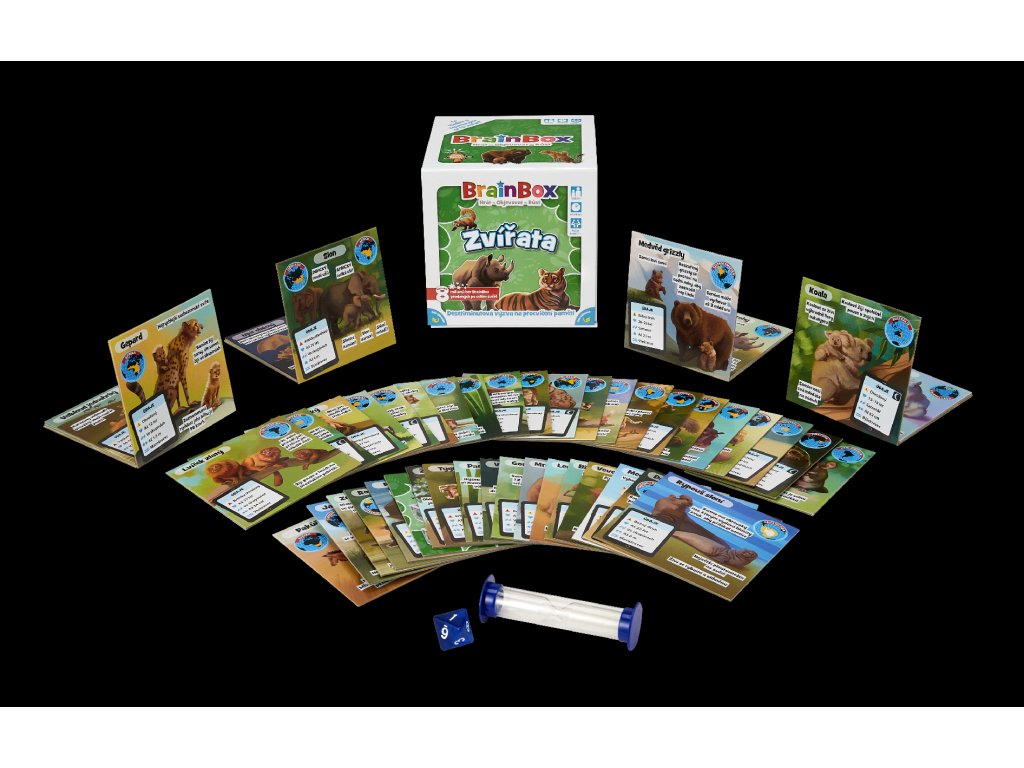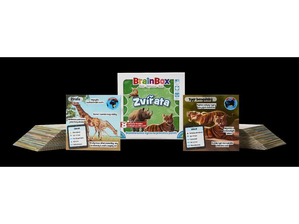 BrainBox Zvířata obsahuje 54 herních karet, přičemž každá z nich obsahuje jednoho zástupce světa zvířat: od polárního medvěda po pumu, od tapíra po tygra a mnoho dalších. Každá karta vás seznámí s jedním zvířecím druhem, dozvíte se jak zvíře žije a díky ručně malovanému obrázku vám zvíře doslova obživne před očima.