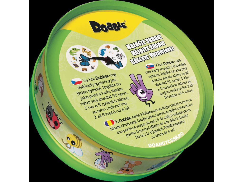 Hráči zde hledají dva stejné symboly na kartách při různých verzích hry (v pravidlech je popsáno celkem 5 her). Super jsou kulaté karty i jednoduchá pravidla vysvětlená doslova za pár sekund. Plechová krabička zaručuje bezpečí karet a jednoduše umožňuje mít hru vždy u sebe. Vyzkoušejte i Vy postřehový fenomén Dobble a jistě budete překvapeni, jak i tak jednoduchá hra může být zábavná a zároveň naučná!
