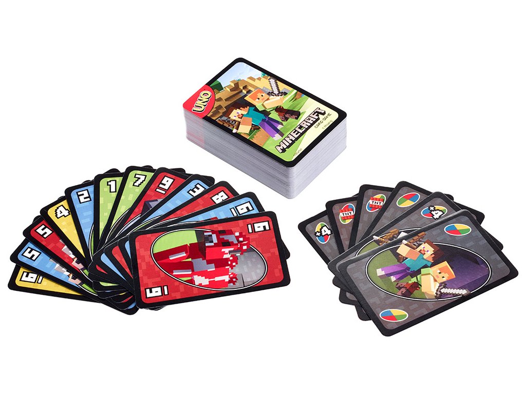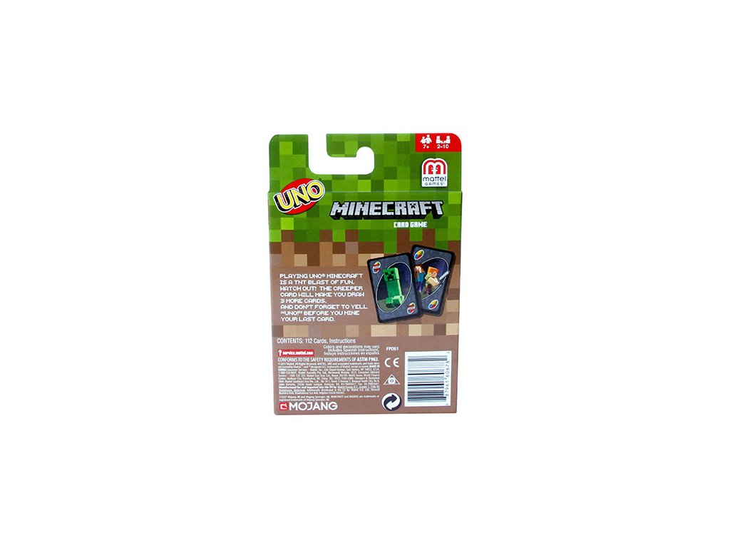 Stejně jako ve hře UNO ™, kterou máte rádi, účastní se hry UNO ™ Minecraft hráči snažící se co nejrychleji zbavit všech svých karet, ale tato verze obsahuje karty s postavami a obrázky Minecraftu a speciální pravidlo! Snažíte se přiřadit kartu ve své ruce k aktuální kartě, která je odkryta navrchu balíčku odložených karet a získáte body za karty, které vašim soupeřům zůstanou v držení. A v UNO ™ Minecraft existuje také nový typ akční karty; když si vytáhnete kartu Creeper, ukažte ji ostatním hráčům a oni si budou muset nabrat další tři karty! První hráč, který dosáhne 500 bodů, vyhrává. Když už máte jen jednu kartu, nezapomeňte zakřičet „UNO!“ Obsahuje 112 karet plus pokyny. Pro 2 až 10 hráčů ve věku od 7 let. Snadné vytáhnout, nemožné odložit. Barvy a dekorace se mohou lišit.
