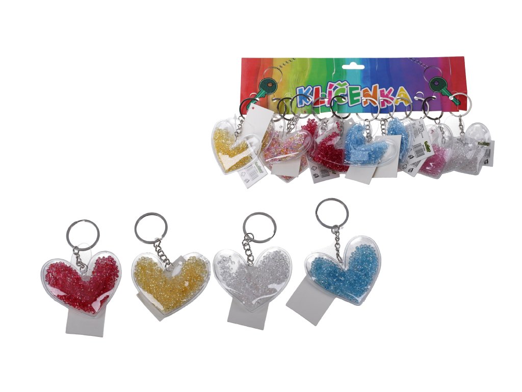 Klíčenka ve tvaru srdce s barevnými kamínky uvnitř. Různé barvy kamínků.
