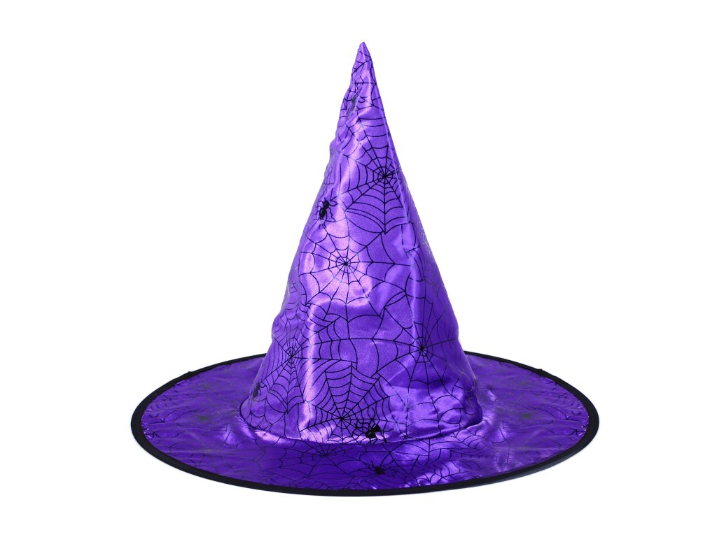 Čarodějnický klobouk je skvělým doplňkem na Halloween párty nebo karneval! Fialový klobouk je dekorován pavučinami a pavouky. Staň se hvězdou večírku díky tomuto klobouku!