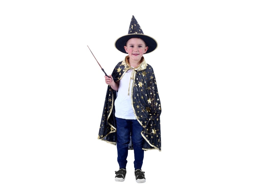 Perfektní souprava pro všechny čarodějnice nebo čaroděje na párty, karneval nebo oslavu Halloweenu! Balení obsahuje čarodějnický plášť černé barvy se zlatým lemováním a hvězdami a perfektně sladěný klobouk. V těchto exkluzivních doplňcích tě zaručeně nikdo nepřehlédne! Určeno pro děti od 3-7 let. Délka 72 cm. Hůlka není součástí balení.