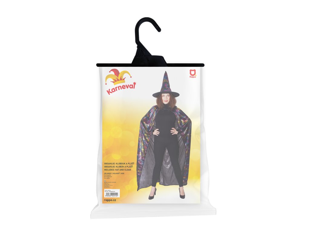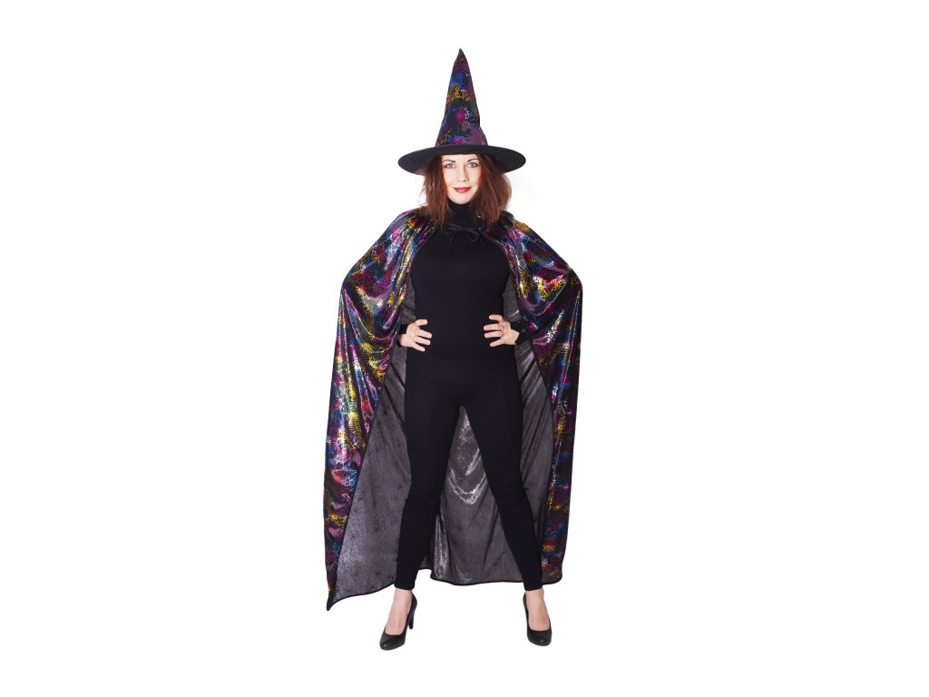 Úžasný černý plášť pro všechny čaroděje a čarodějnice! Plášť je určen pro dospělé a je dekorován potiskem barevných pavučin. Součástí kostýmu je perfektně sladěný klobouk. Plášť je dlouhý cca 140 cm. Ideální na karneval nebo halloweenskou párty. Hůlka není součástí balení.