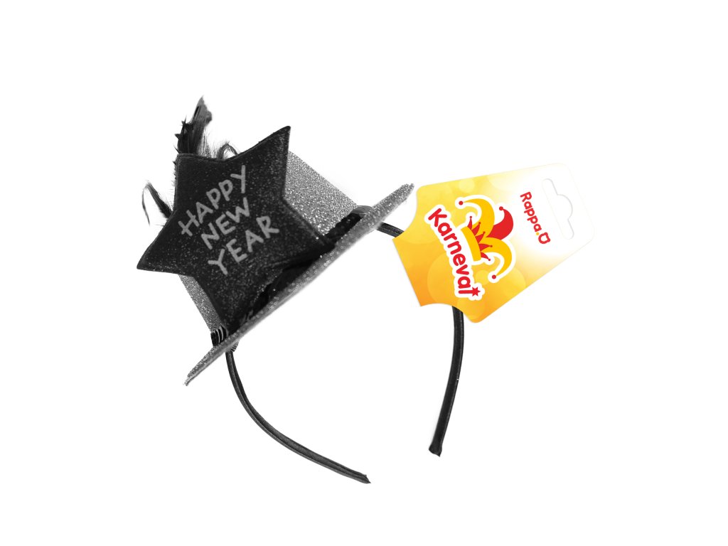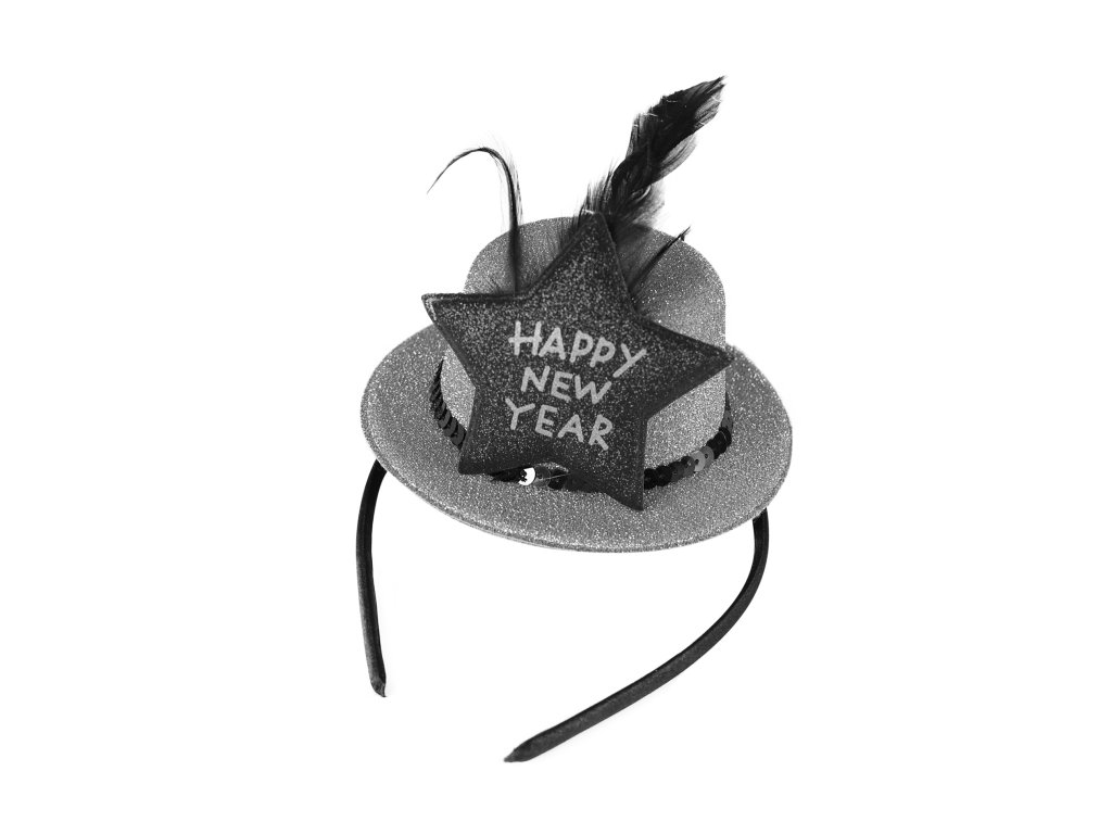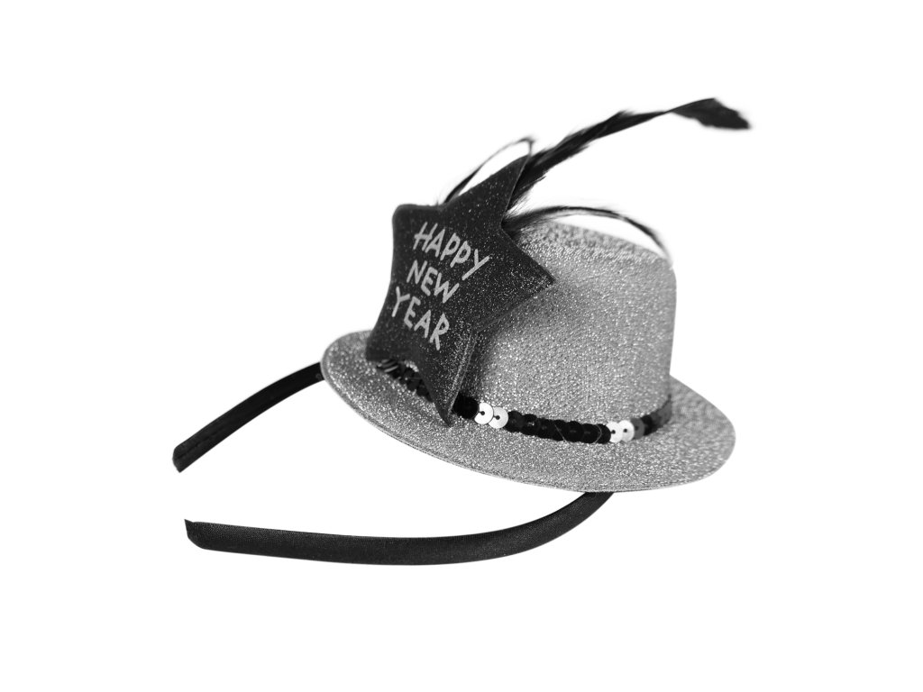 Stylový mini klobouk zlaté barvy s nápisem HAPPY NEW YEAR je senzačním doplňkem na oslavu nebo večírek při vítání Nového roku! Klobouček je připevněn na čelence pomocí gumiček.