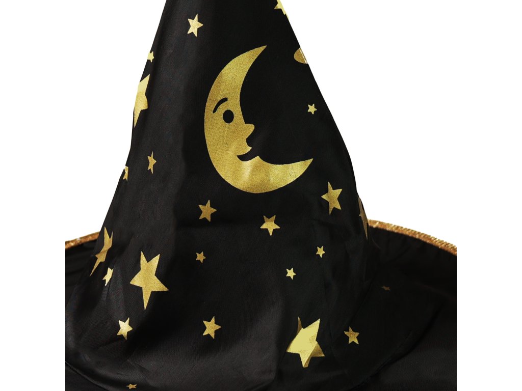 Čarodějnický klobouk je skvělým doplňkem tvého kostýmu! Klobouk černé barvy je zdoben zlatými motivy. Průměr klobouku činí 19 cm.