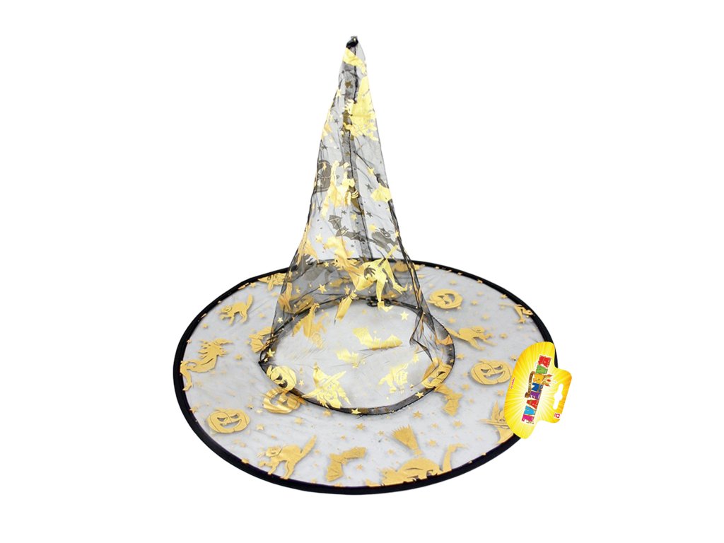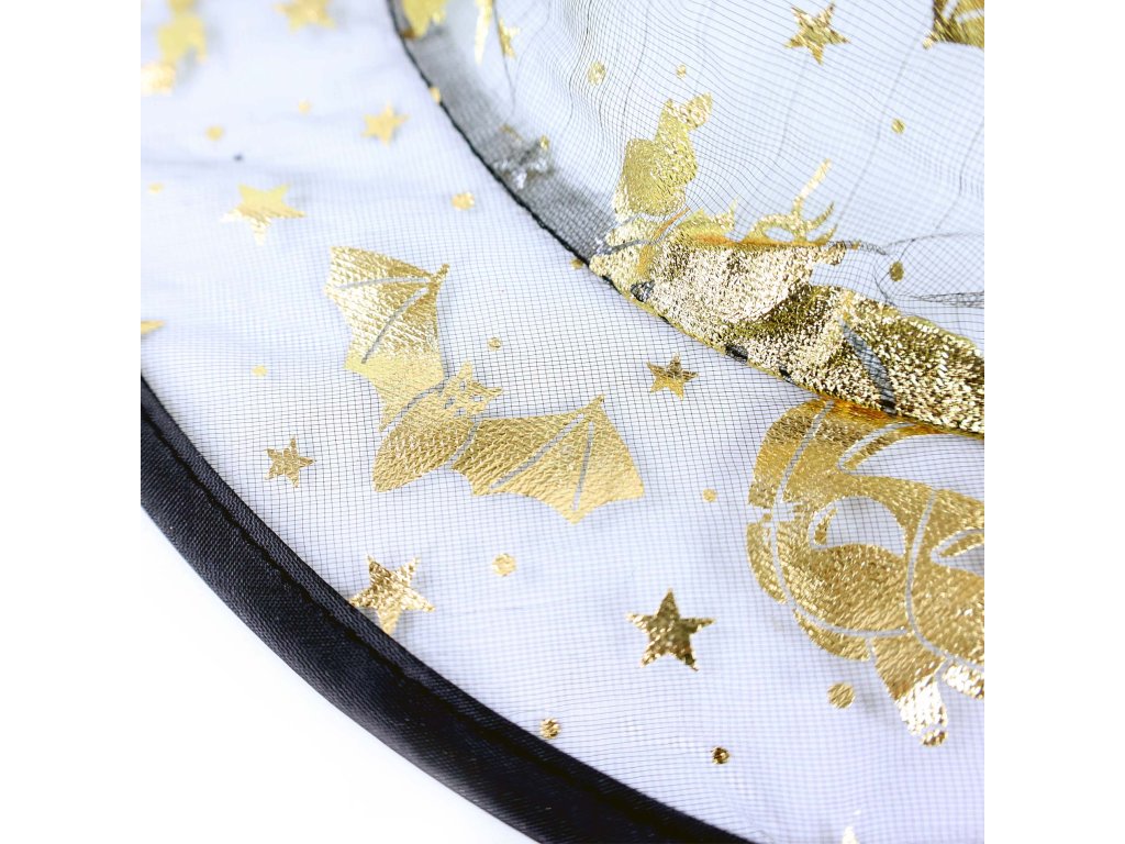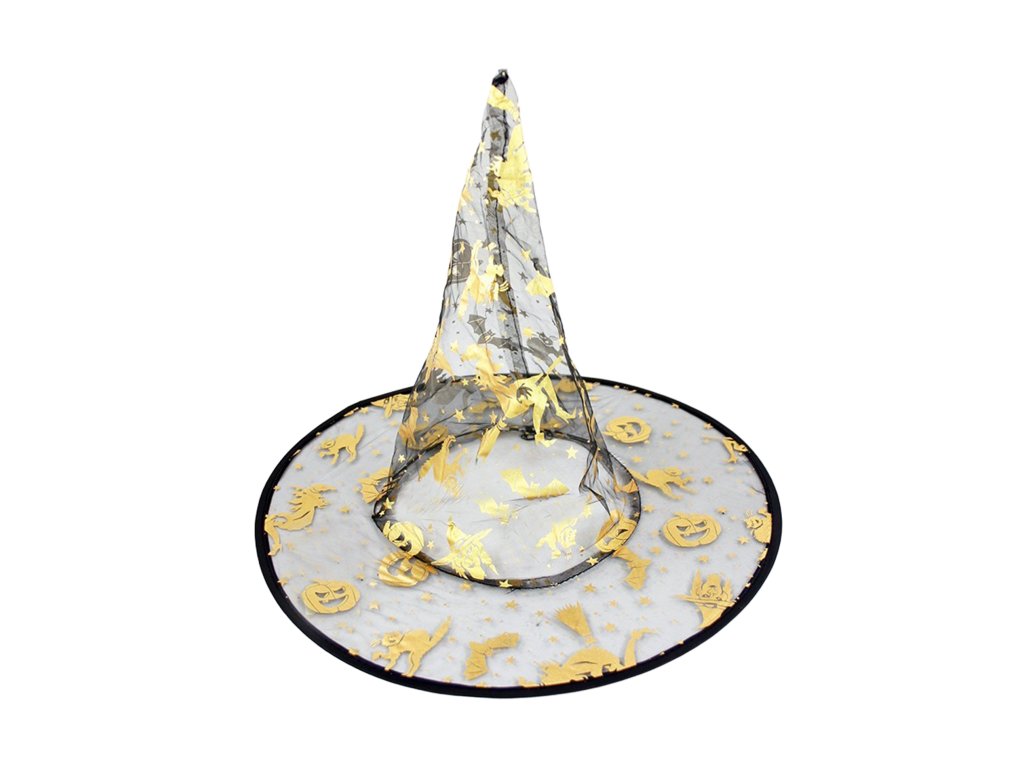 Čarodějnický klobouk s magickými motivy je skvělým doplňkem na Halloween párty nebo karneval! Klobouk je vyroben z černé síťky a je zdoben zlatými obrázky. Staň se hvězdou večírku díky tomuto klobouku!