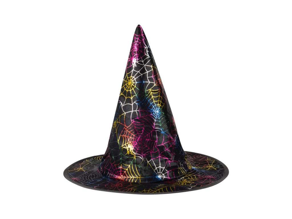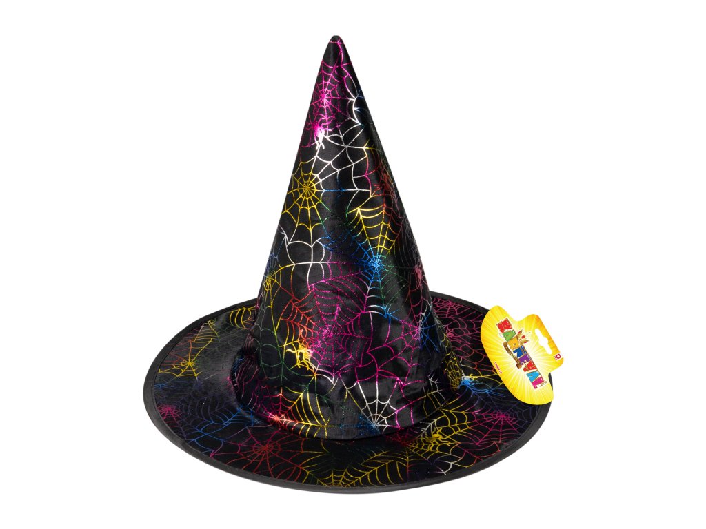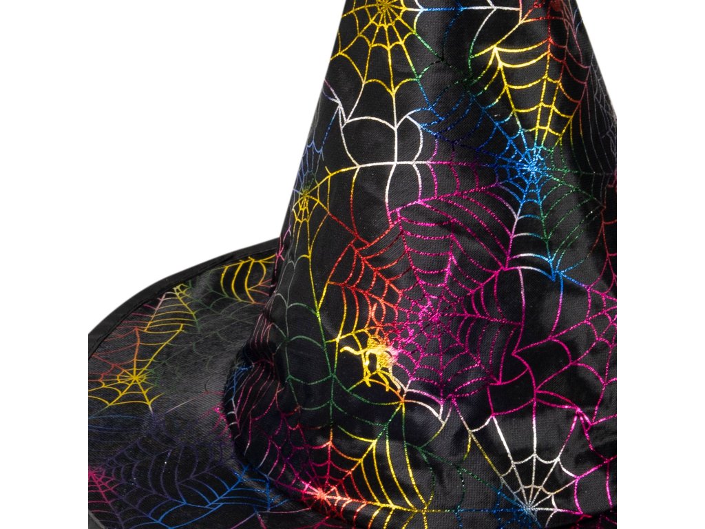 Veselý halloweenský klobouk je skvělým doplňkem na besídku nebo karneval! Klobouk černé barvy je zdoben barevnou pavučinkou.