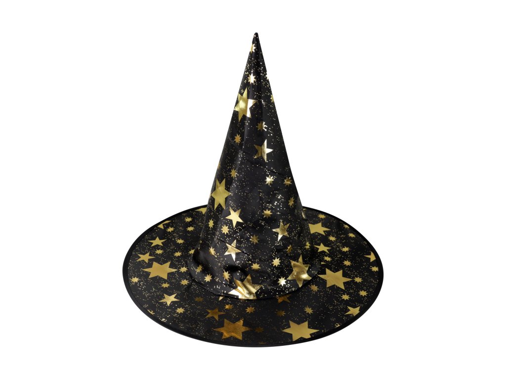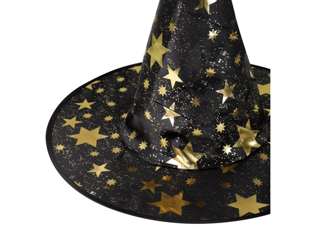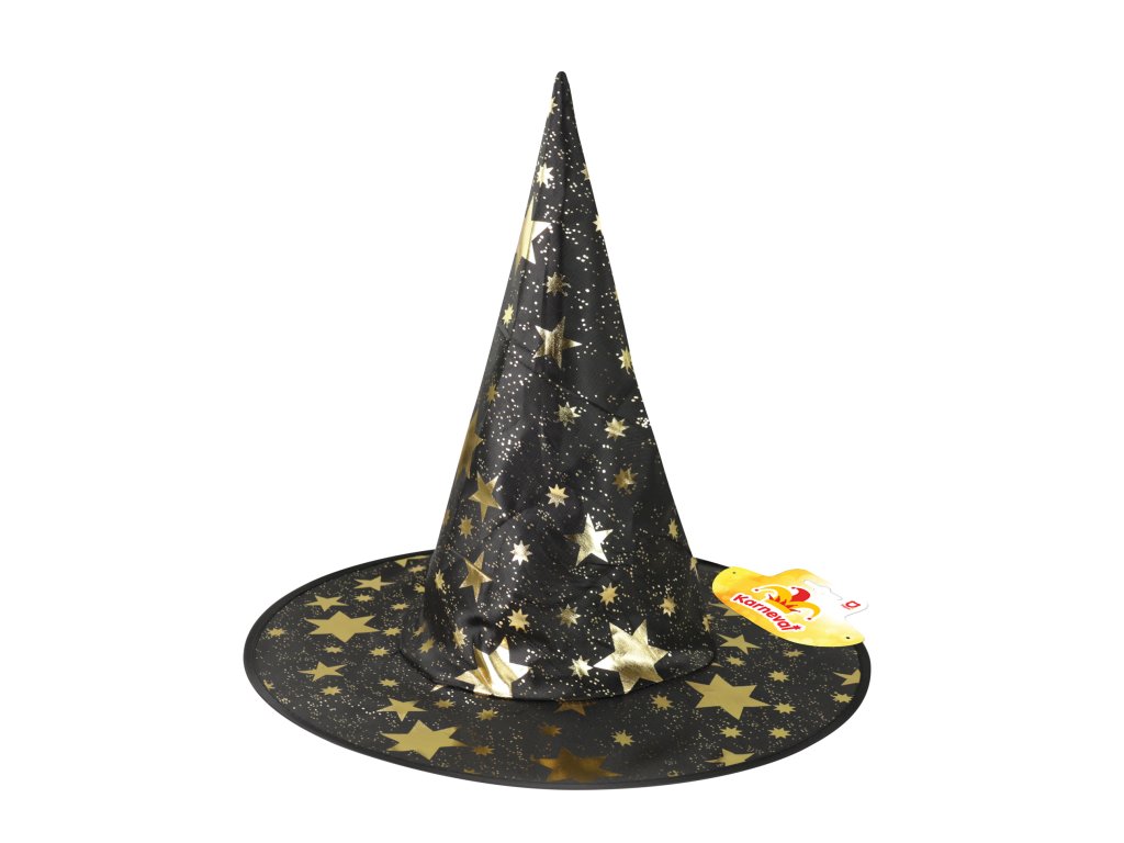 Úžasný čarodějnický klobouk v černé barvě s potiskem zlatých hvězdiček. Ideální i na halloweenský večírek nebo karneval!