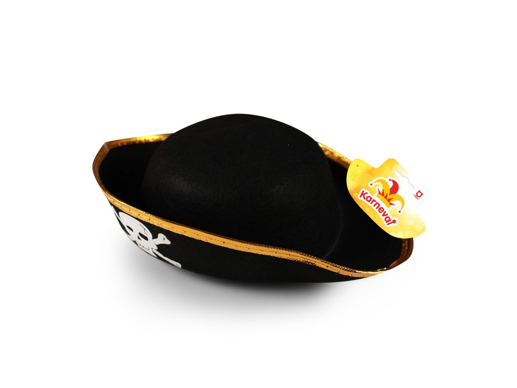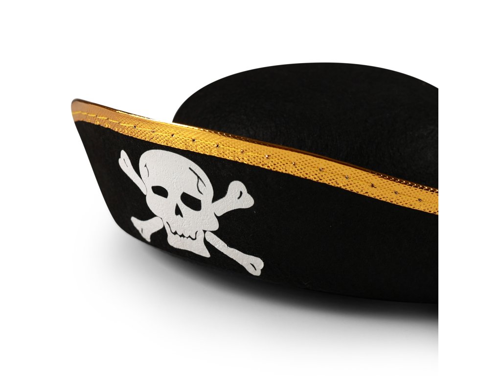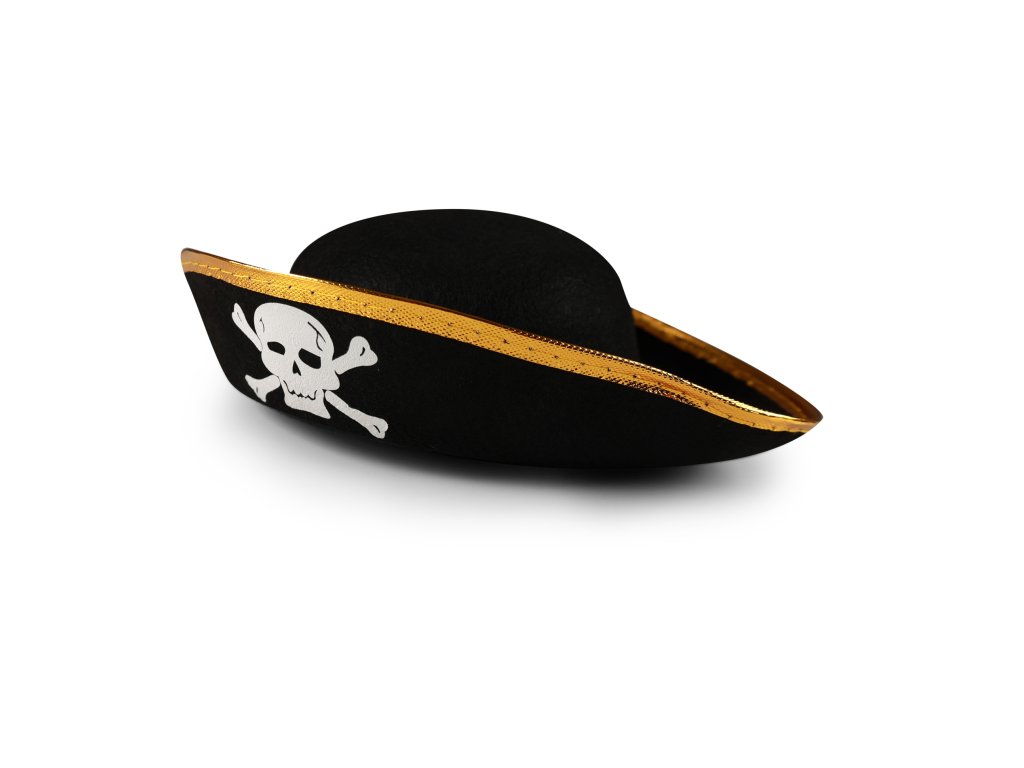 Úchvatný klobouk pro malé piráty! Tento černý klobouček je zdoben bílým potiskem s motivem lebky na přední straně a zlatým lemováním.