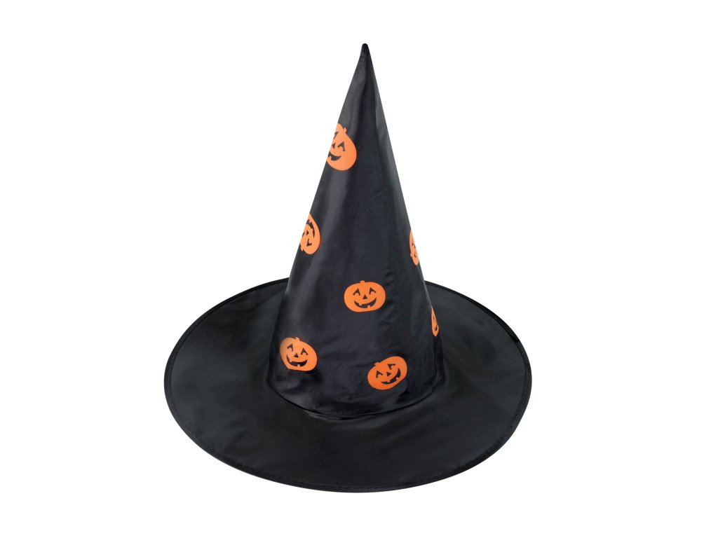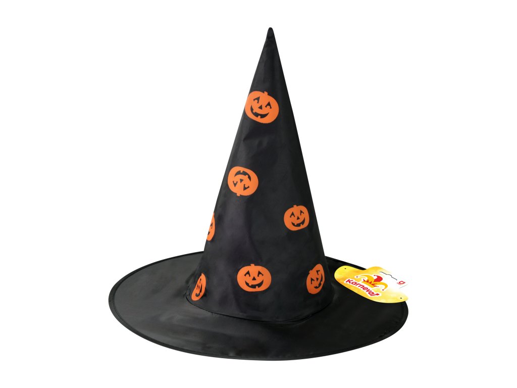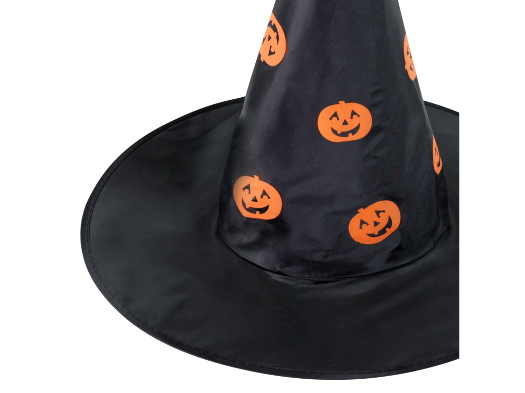 Úžasný čarodějnický klobouk v černé barvě s potiskem oranžových dýní. Ideální na halloweenský večírek nebo karneval!