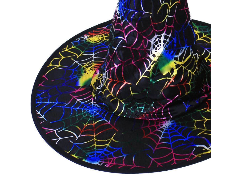 Karnevalový klobouk černé barvy zdoben barevnými magickými pavučinami je určen pro dospělé.