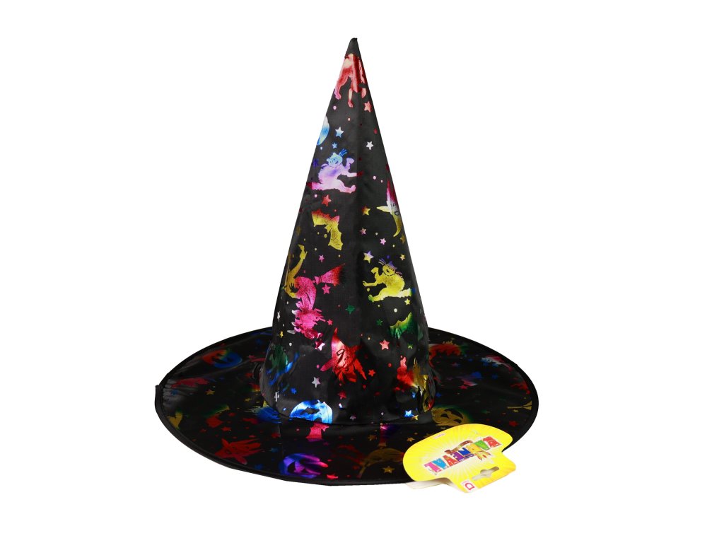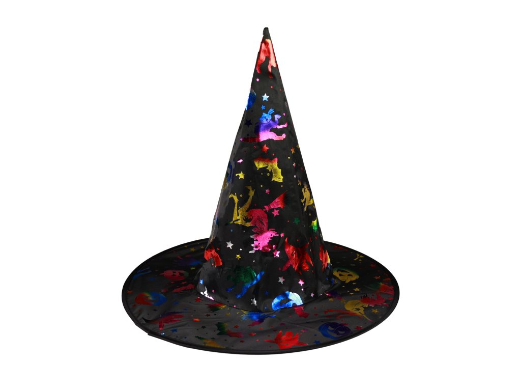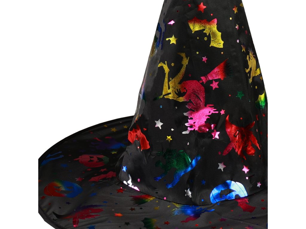 Čarodějnický klobouk pro dospělé! Klobouk černé barvy je vysoký 34 cm a zdoben barevnými magickými symboly. Staňte se hvězdou karnevalového večírku díky tomuto nepřehlédnutelnému klobouku a ohromte tak všechny své přátele!
