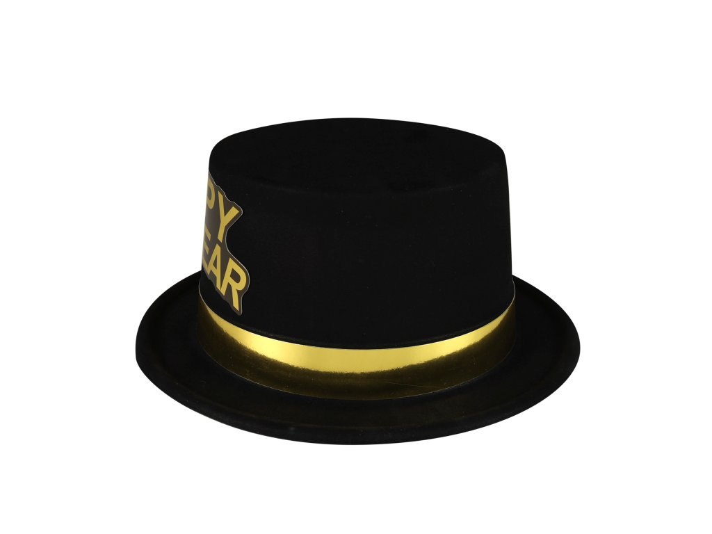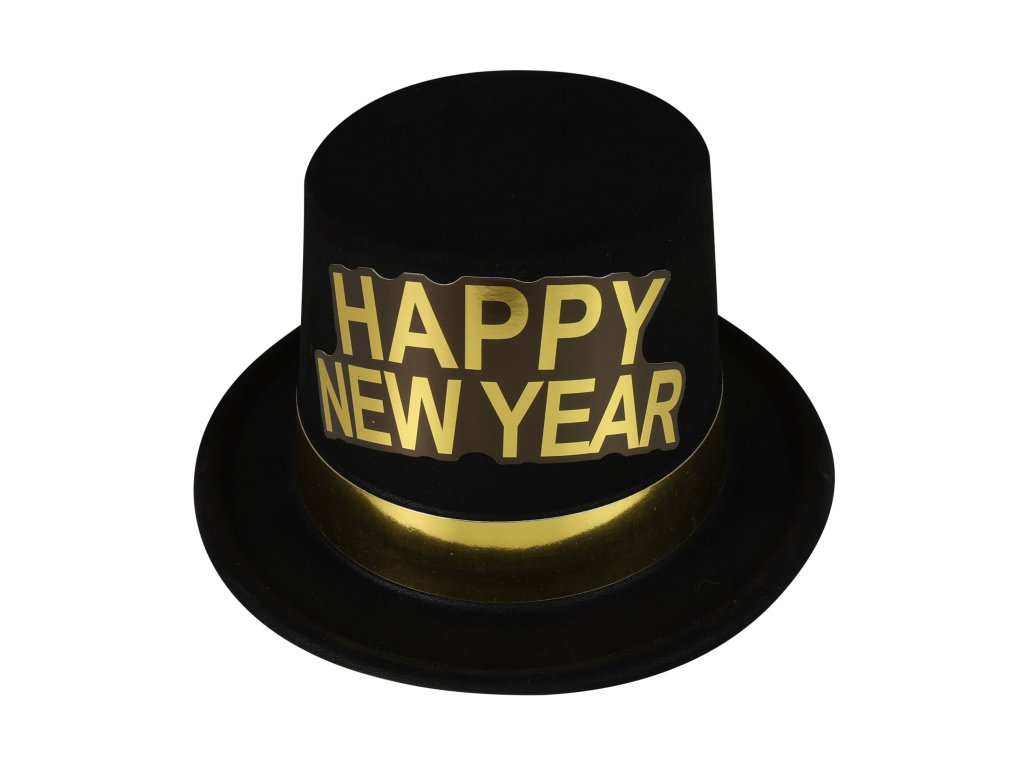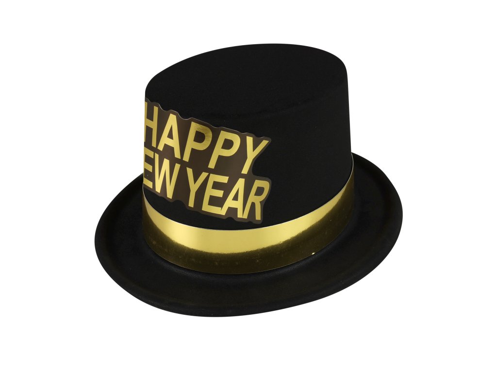 Černý klobouk se zlatým lemem a nápisem HAPPY NEW YEAR je senzačním doplňkem na oslavu nebo večírek při vítání Nového roku!