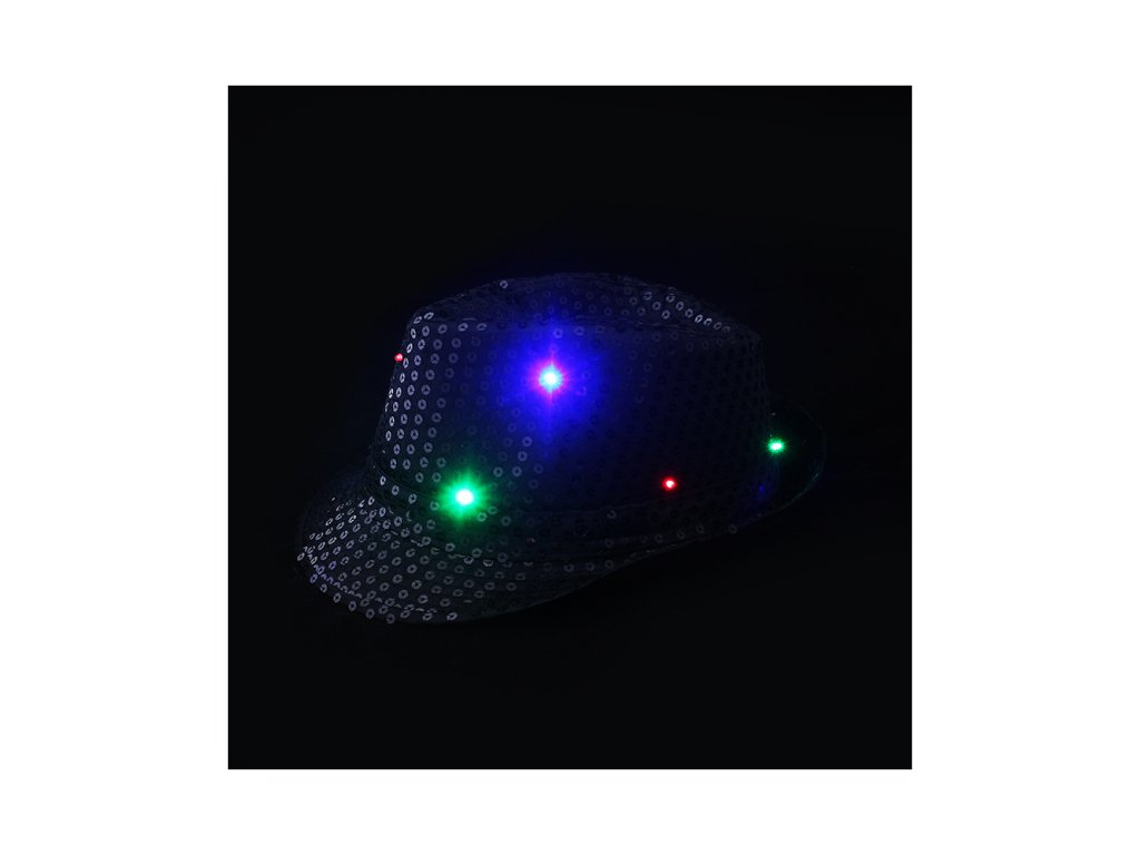 Rozjeď tu pravou disko párty s tímto senzačním kloboukem! Stylový klobouček černé barvy je zdoben flitry, a navíc po zapnutí barevně bliká - 3 rychlosti blikání (při každém dalším zmáčknutí se rychlost blikání změní). K aktivaci světýlek použijete nenápadné tlačítko, které je umístěno na boku klobouku. 3 baterie typu LR44 jsou jeho součástí.
