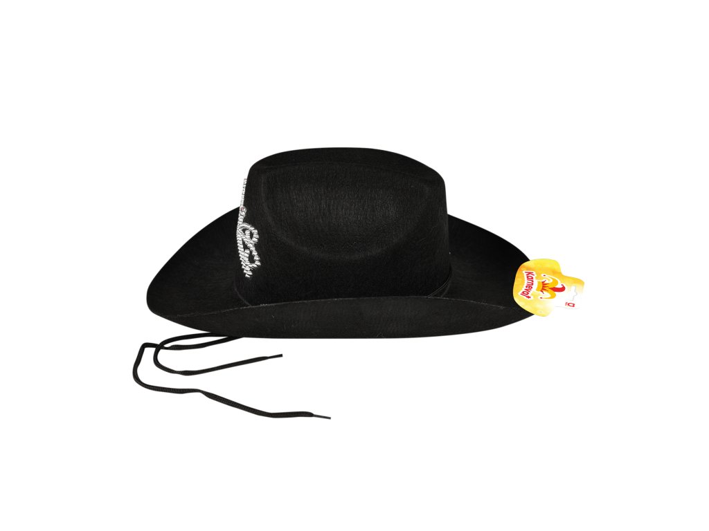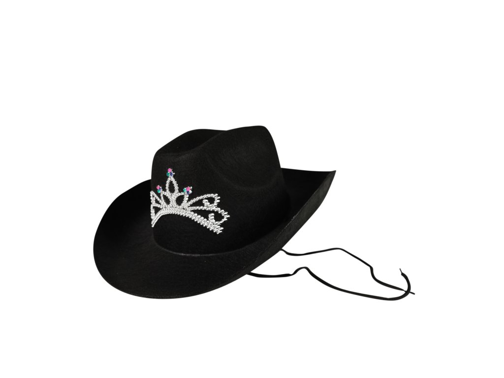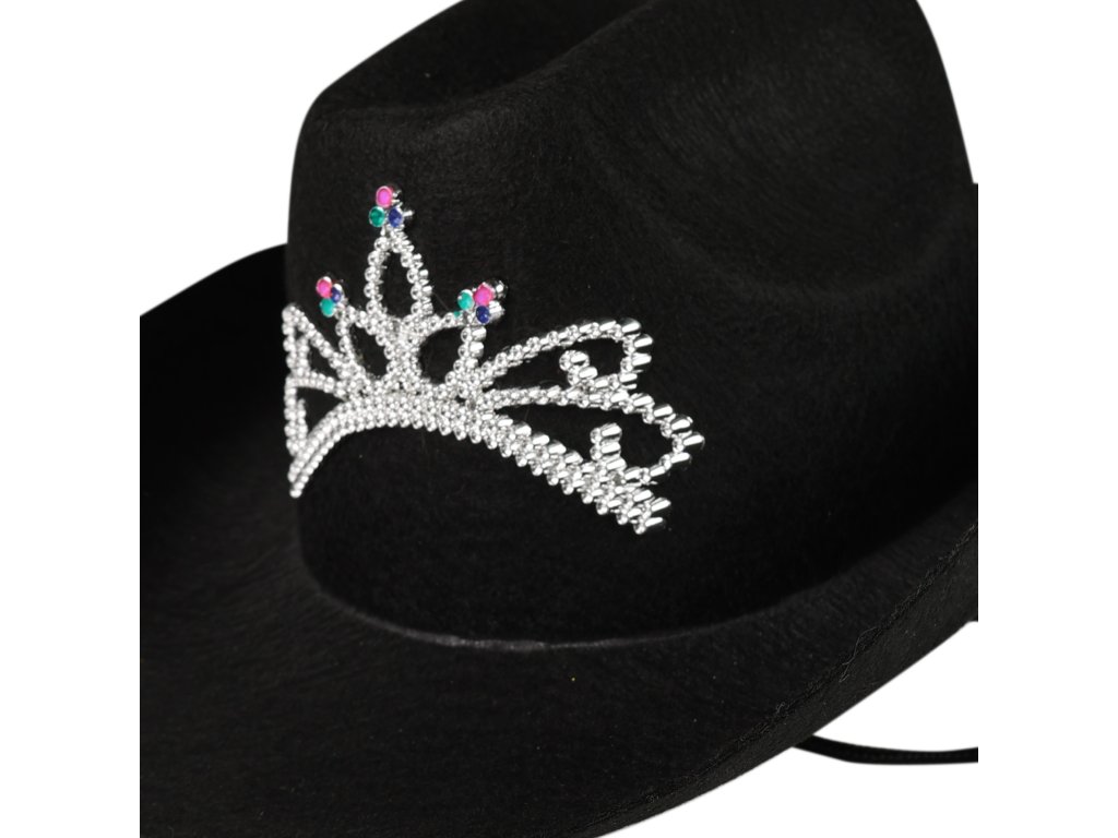 Tento černý elegantní kovbojský klobouk je zdoben stříbrnou korunkou. Klobouk je určen pro dospělé. Kovbojský dámský klobouk je vysoký 14 cm. S tímto kloboukem budeš nepřehlédnutelná!
