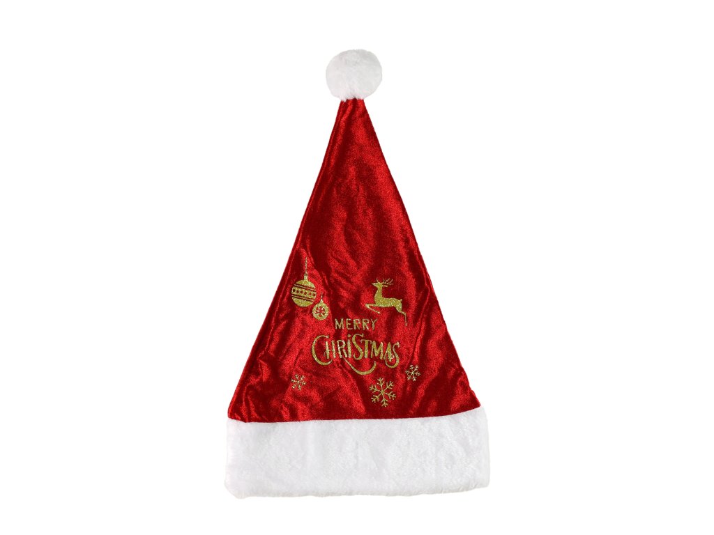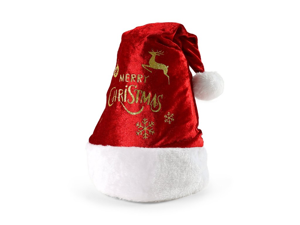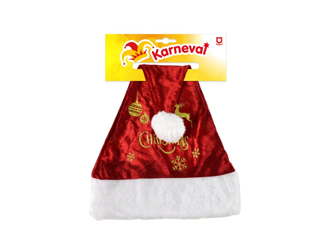 Stylová červená čepice se zlatým vánočním potiskem a bílou bambulkou je deální doplněk ke kostýmu nebo jen tak na vánoční večírek!