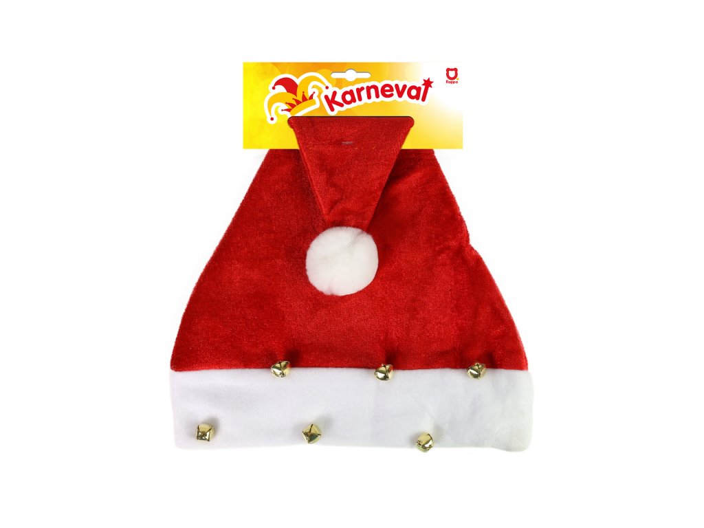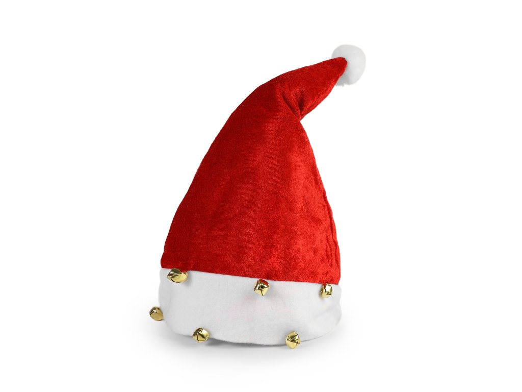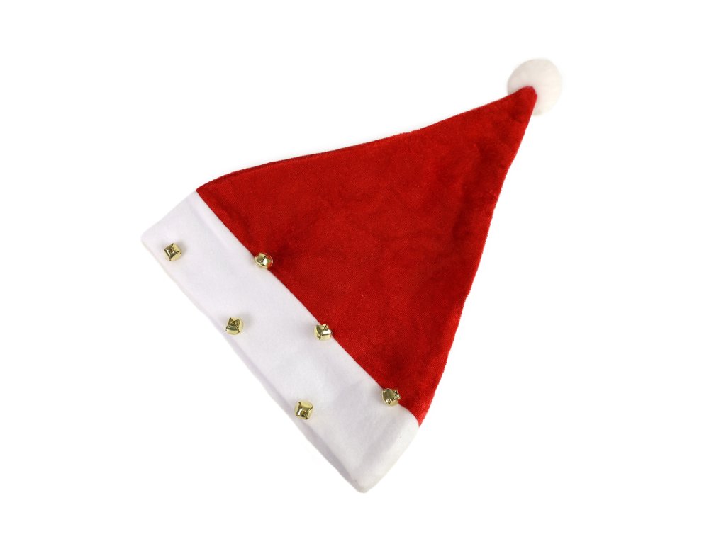 Stylová vánoční čepice s bílým lemováním, zdobená rolničkami a bambulkou. Ideální doplněk ke kostýmu nebo jen tak na vánoční večírek!