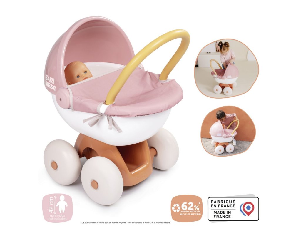 Hluboký kočárek pro panenku z řady Baby Nurse navržený speciálně pro nejmenší. Vyrobený z kvalitního plastu, který se snadno čistí. Látkový potah je snímatelný a pratelný. Extrémně stabilní konstrukce, která je díky čtyřem kolečkům velmi dobře ovladatelná. Vhodné pro všechny panenky do 42 cm. Panenka není součástí balení. Tento výrobek obsahuje minimálně 62 % recyklovaného materiálu. Rozměry produktu (DxŠxV): 54 x 37 x 48 cm.