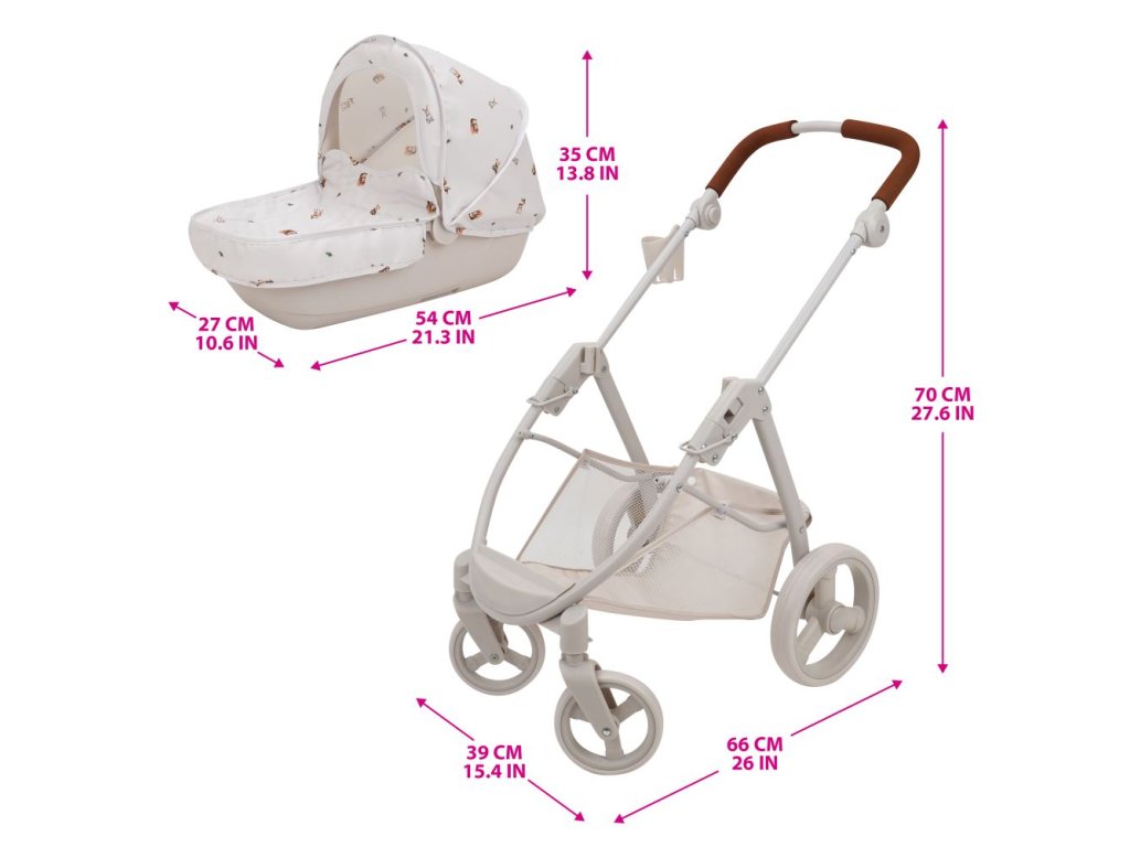 Kočárek Bella pro panenky 2 v 1 • Rozměry výrobku cca 67,5 x 40,5 x 74 cm • Luxusní kočárek s odnímatelným kočárkem • Dodává se se stříškou a návlekem na botičku • Nastavitelná rukojeť • Otočné přední kolo • Velký košík • Součástí balení je taška na příslušenství • Vhodné pro panenky do cca 53 cm