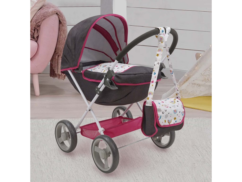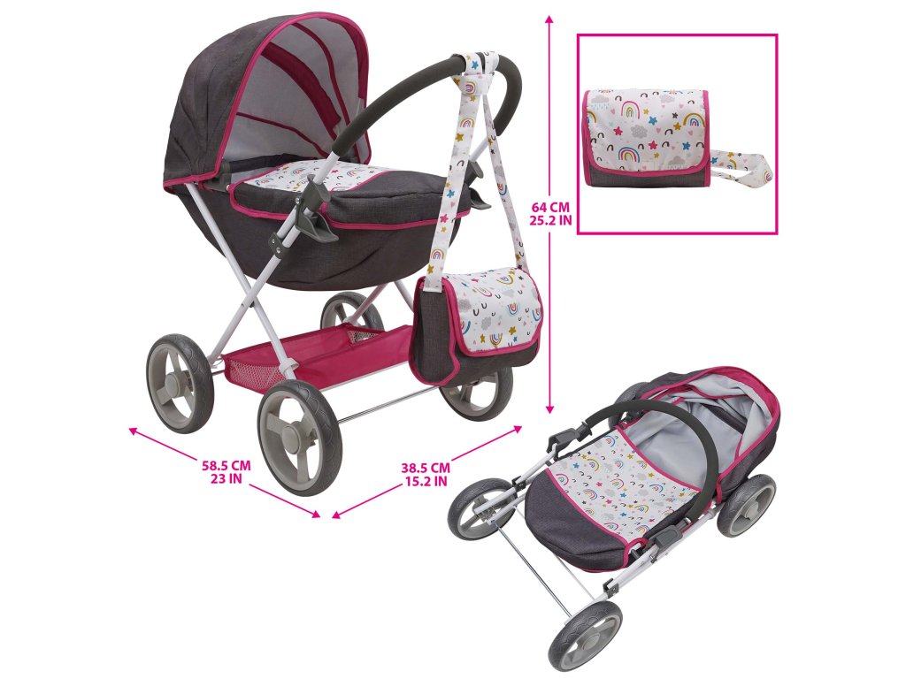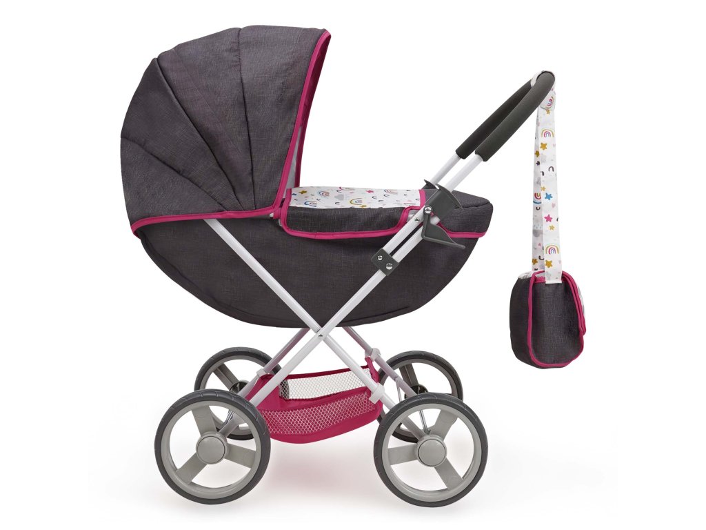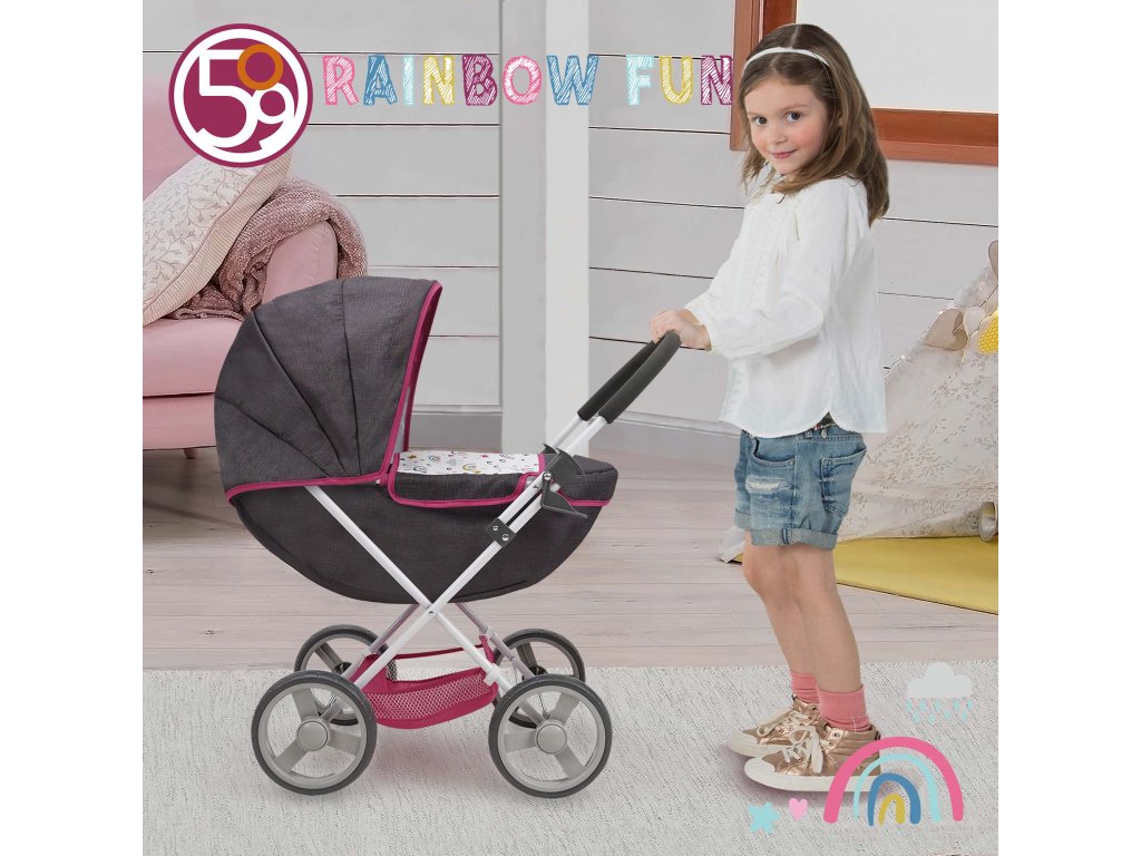 Kočárek pro panenky 509 Crew Carol. Komfortní pěnová rukojeť. Stahovací stříška. Velký nákupní košík. Skladací pro snadné skladování. Pohodlně se hodí pro panenku 13" - 18"