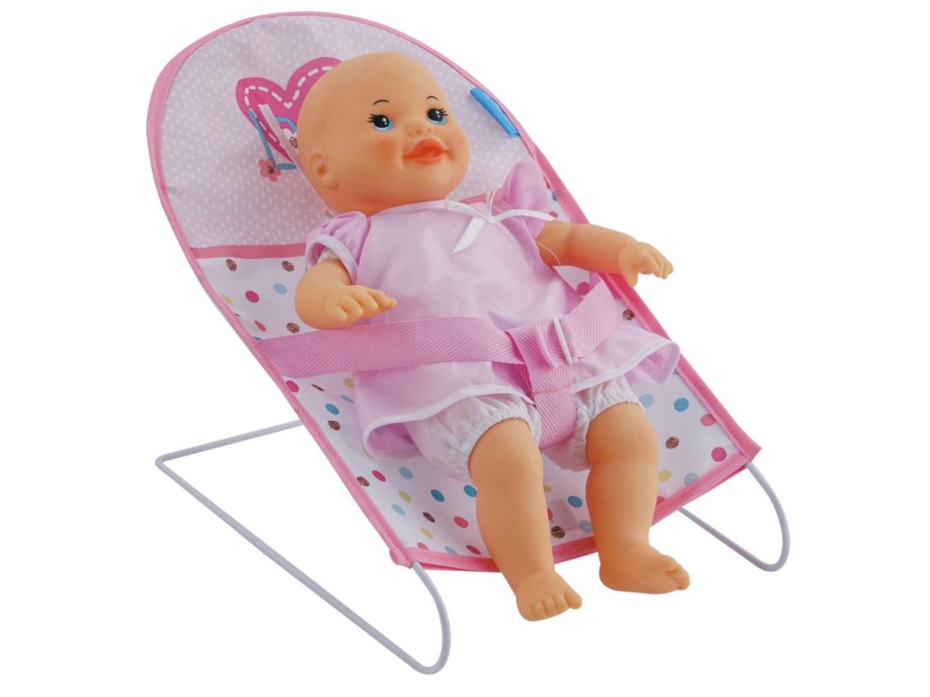 Nádherná sada 3v1 pro panenky do 45 cm obsahuje kočárek, panenku a houpátko.