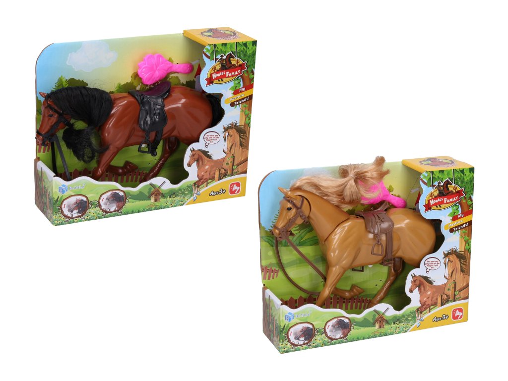 Kůň s hřebenem a zvukovými efekty. Velikost 26 cm. Zvukové efekty předkloněním hlavy. 2xAG13 baterie součástí. 2 varianty - tmavě hnědý, světle hnědý.