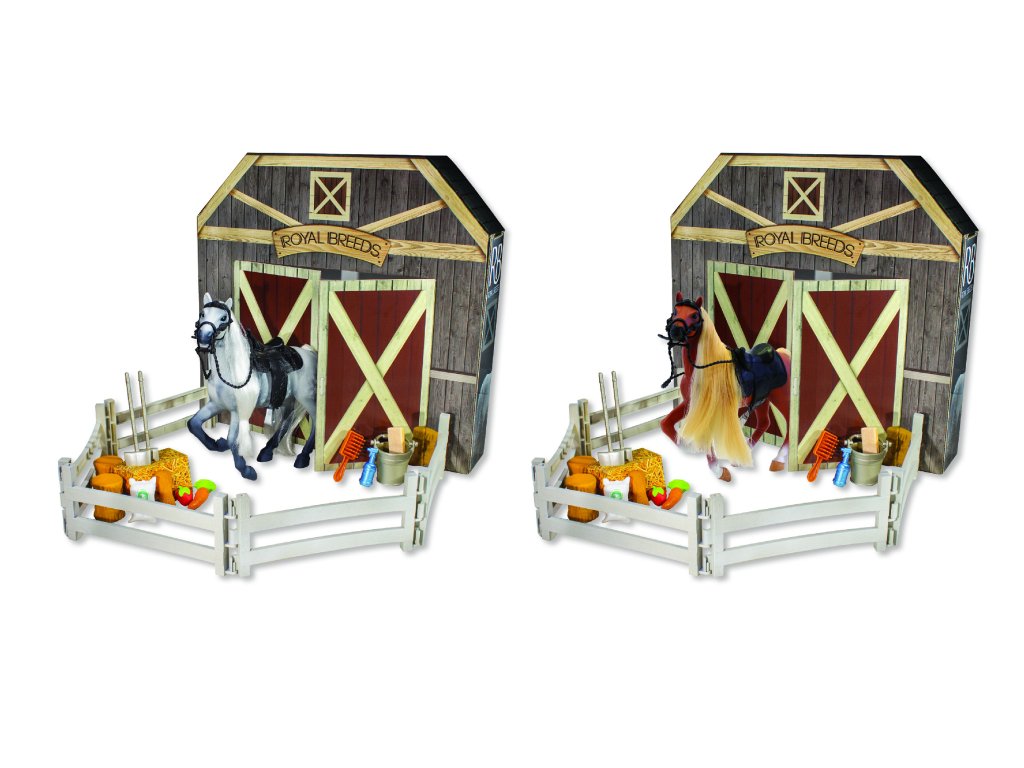 Royal Breeds Koník s ohradou. Velikost 17 cm. Obsahuje také různé příslušenství. Zadní strana obalu se otevírá jako vrata do stájí. 2 varianty - hnědý, šedý