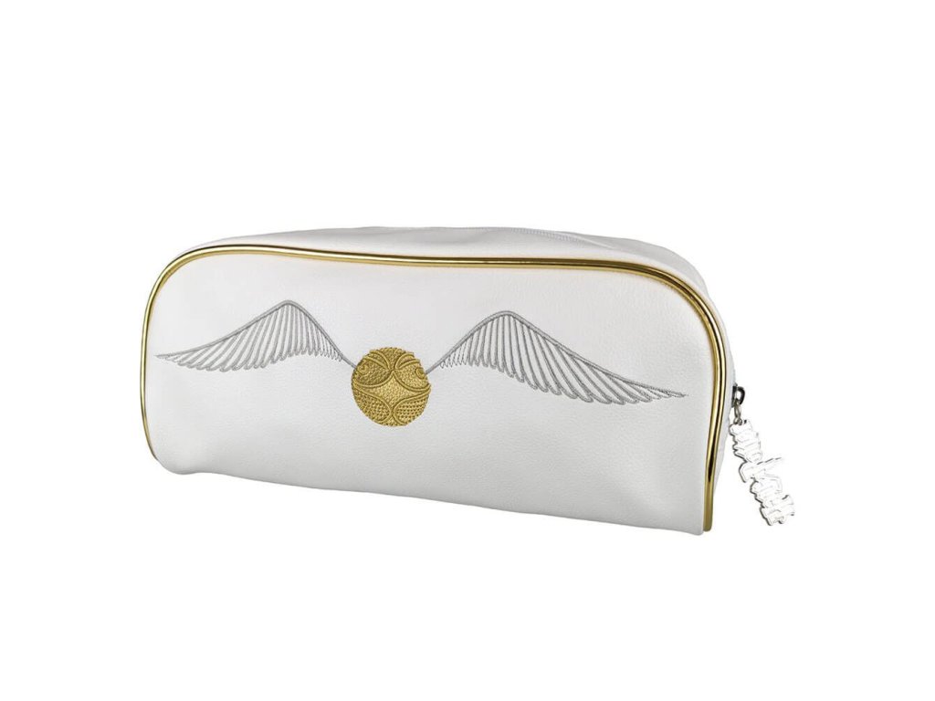 Bílá jednoprostorová kosmetická taštička. Na přední straně je vyzobrazený znak Zlatonky. Taštička je na zip s přívěskem Harry Potter.