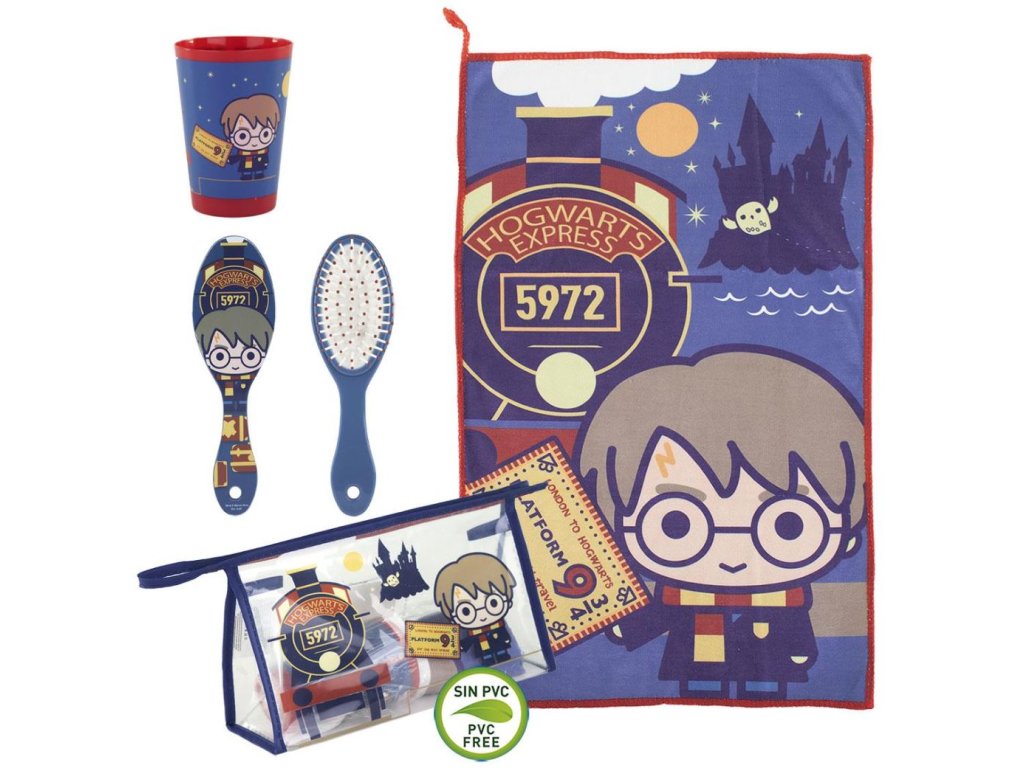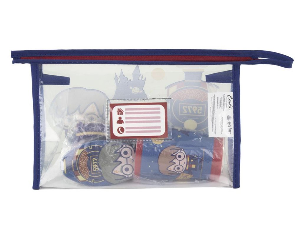 Kosmetický set skládající se z průhledné tašky, hřebenu, plastového kelímku zabalený v tašce s motivem Harry Potter Hogwarts Expres (Bradavický expres).