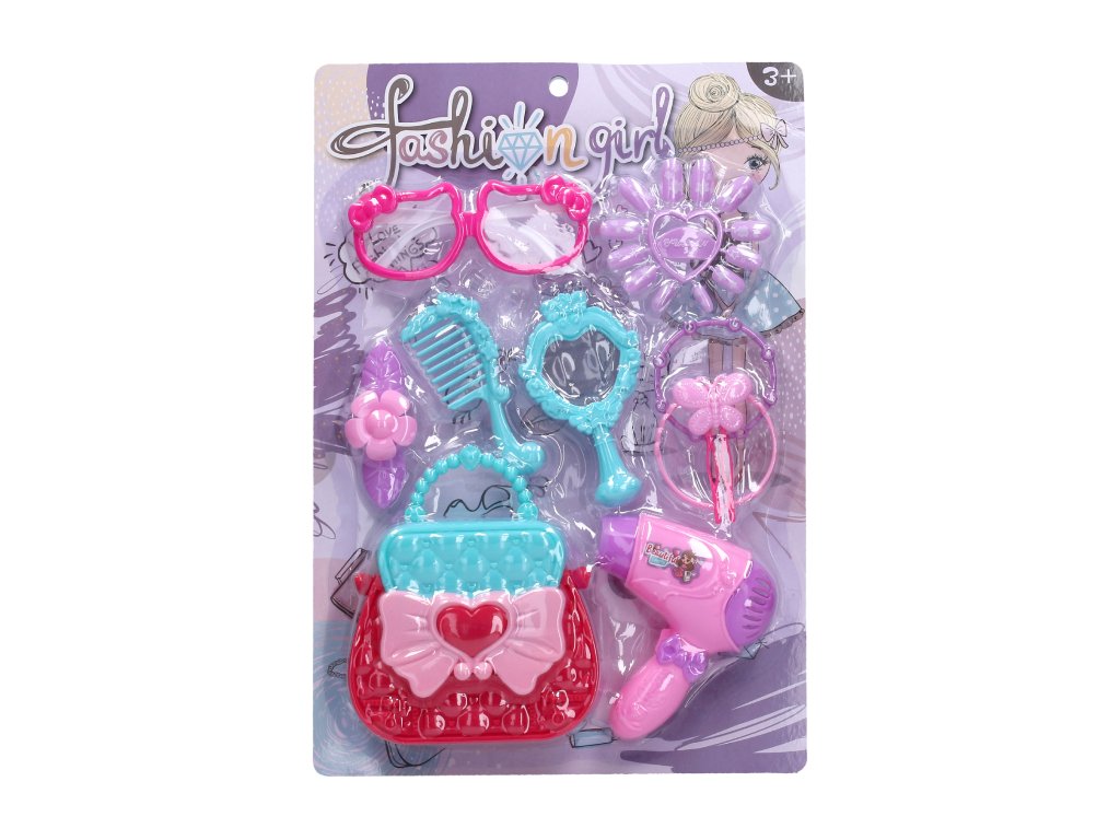 Kosmetický set. Součástí brýle, nehty, hřeben, zrcátko, náramky, kabelka, fén a další.