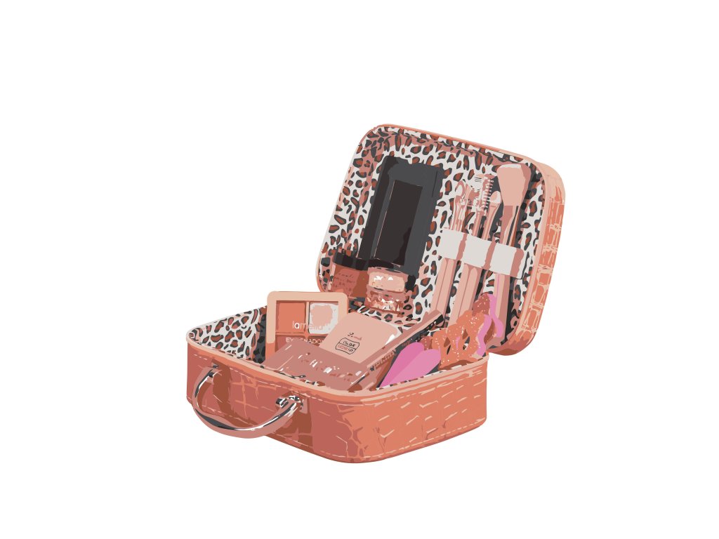 Kufřík s kosmetikou. Velikost 19 cm. Obsahuje zrcátko, umělé nehty, lesk na rty, tvářenku, oční stíny, pilníky na nehty, sadu štětců, balzám na rty, oční linky, třpytivé dekorace.