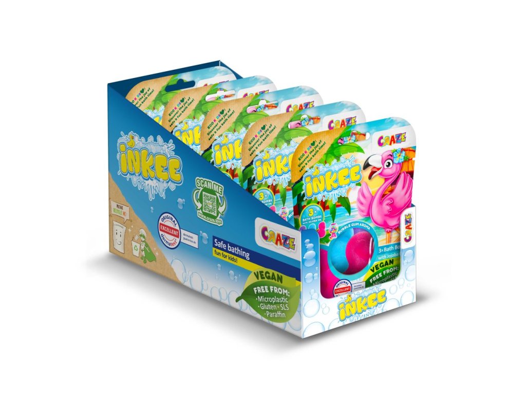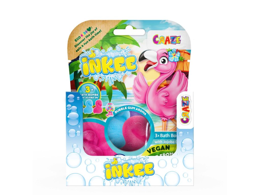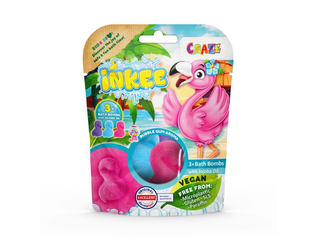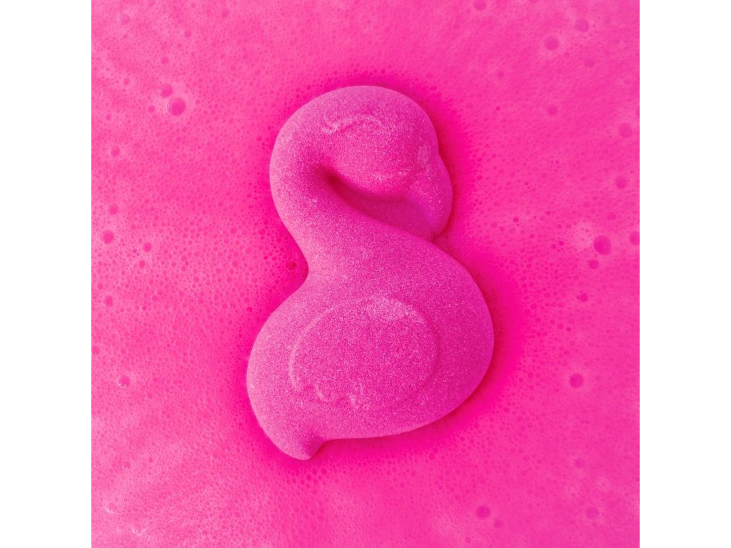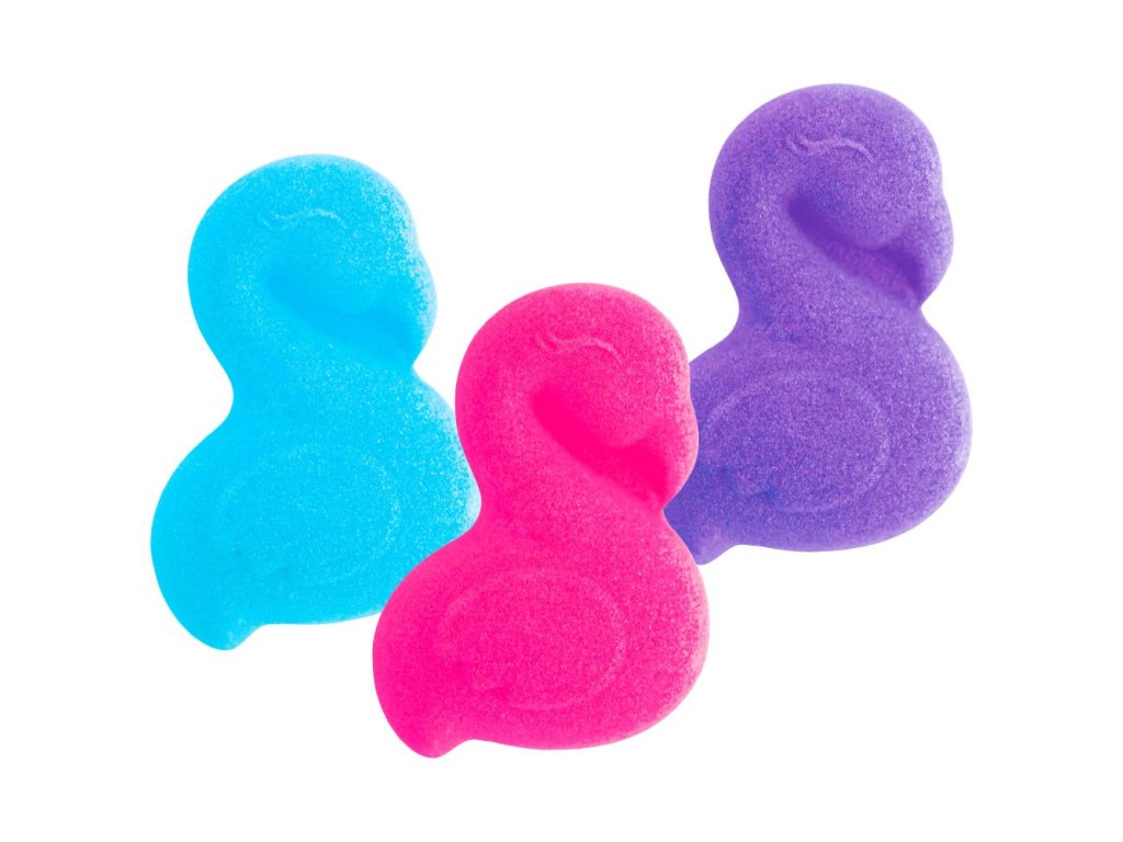 Balení 3x55g pěnových bomb do koupele ve tvaru plameňáka. 3 barvy v jedné tašce: růžová, fialová a modrá. S jojobovým olejem a vůní žvýkaček. Baleno v papírovém sáčku s okénkem. Display 5ks.