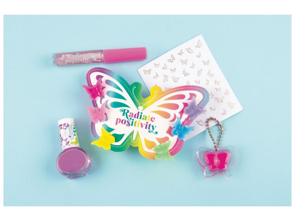 Rozkveťte do okřídlené krásy se sadou Butterfly. Proměňte svůj vzhled od hlavy až k patě pomocí motýlkových spon do vlasů, samolepek na nehty, které zafixujete levandulovým lakem a leskem na rty. Věk od 8+.