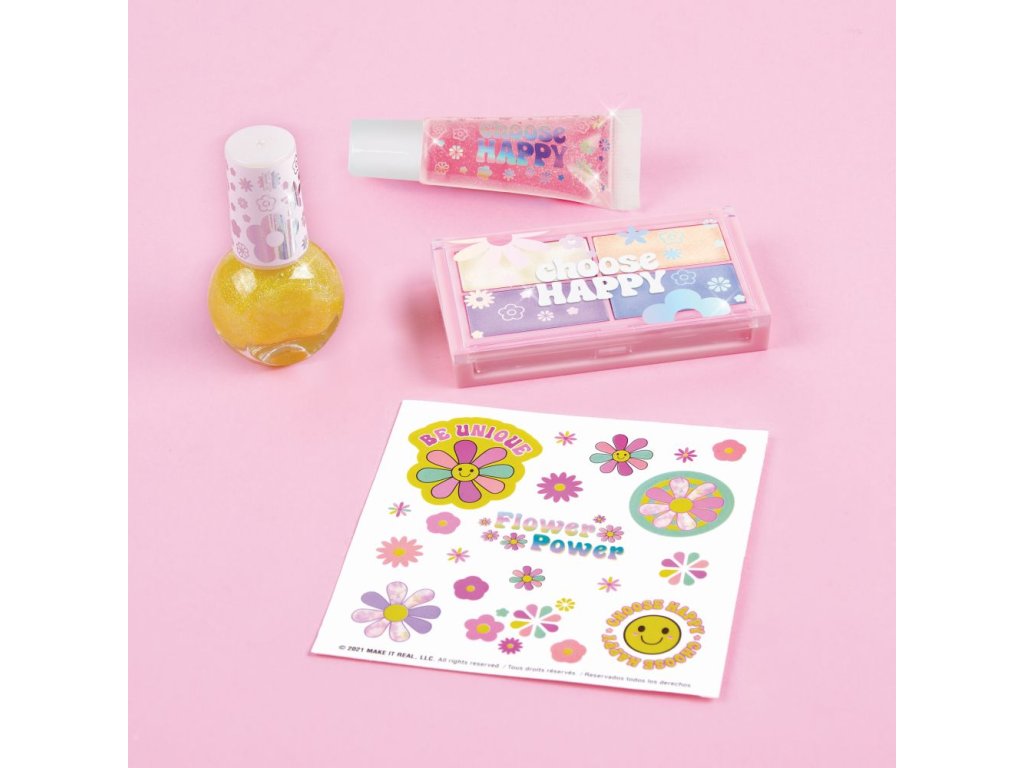 paletky očních stínů, 1 tubu lesku na rty a arch nálepek. Věk 8+.