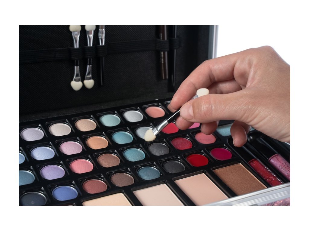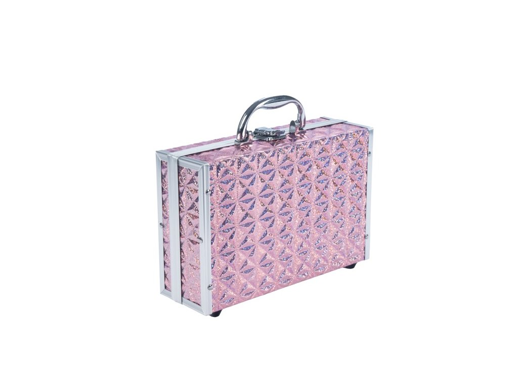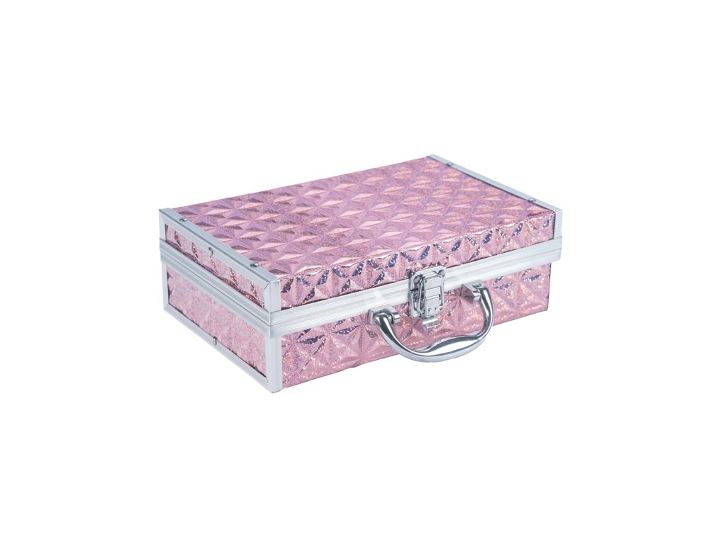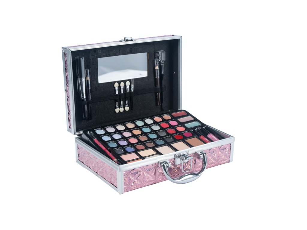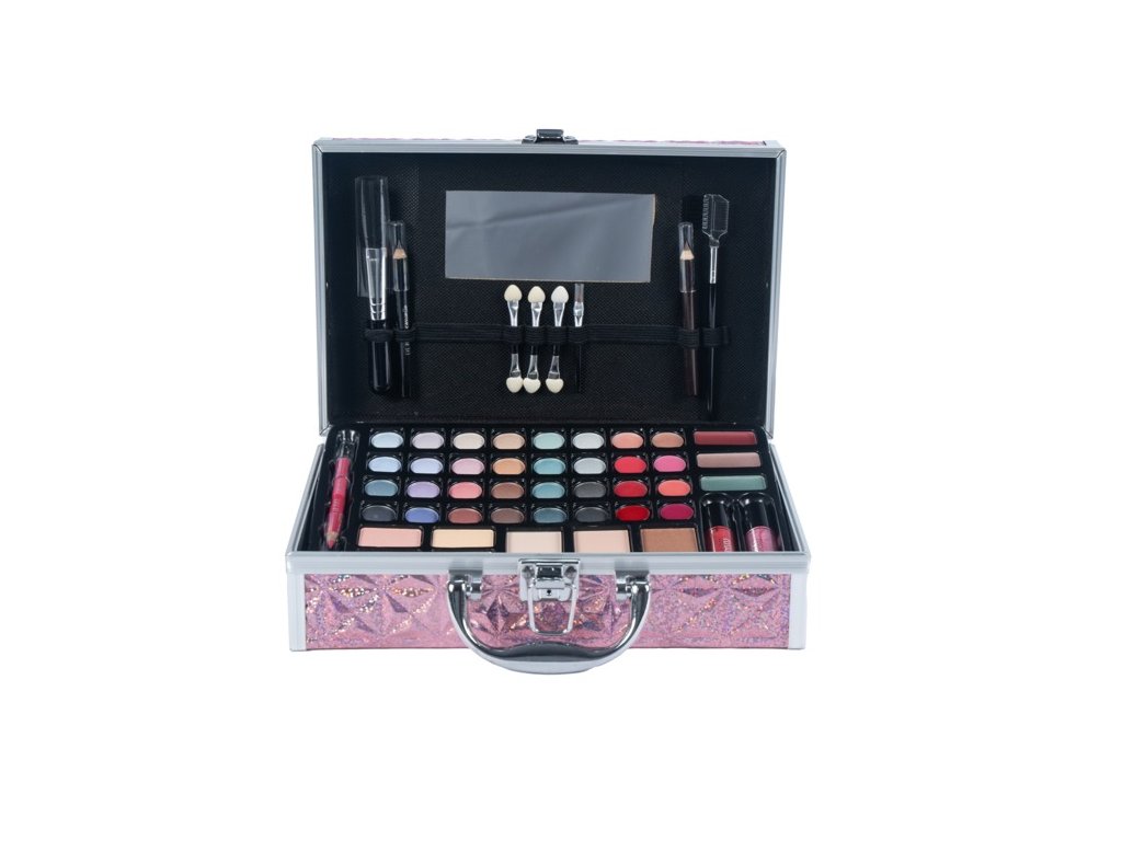 Kosmetický kufřík pro slečny obsahuje oční stíny, leksy na rty, tvářenky, konturovací tužku na rty, zrcátko, aplikátory na oční stíny, tužky na oči, štětečky.
