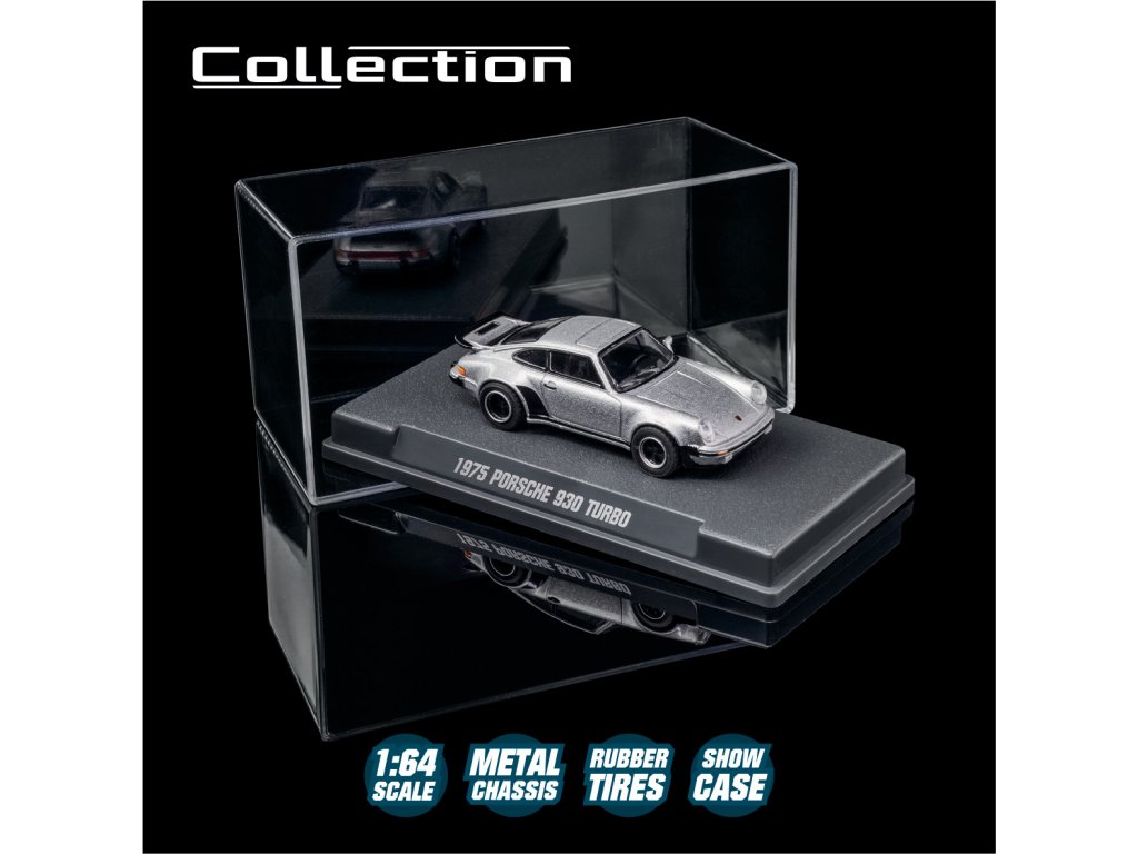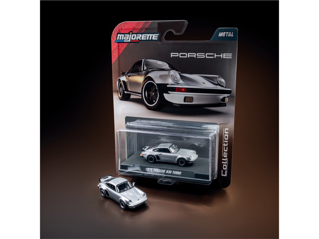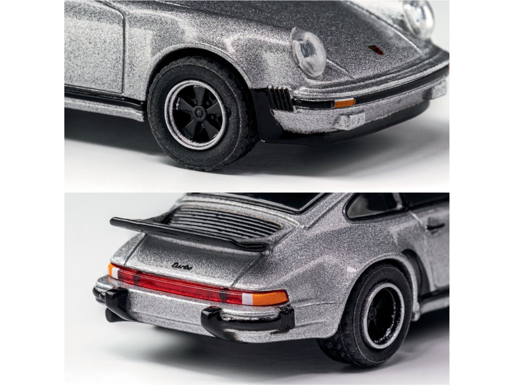 Kovový model autíčka 1975 Porsche 930 Turbo, na volnoběh, s díly, které lze otevřít a/nebo s pohyblivými částmi, s odpružením.V měřítku 1:64, délka: 7,5 cm.