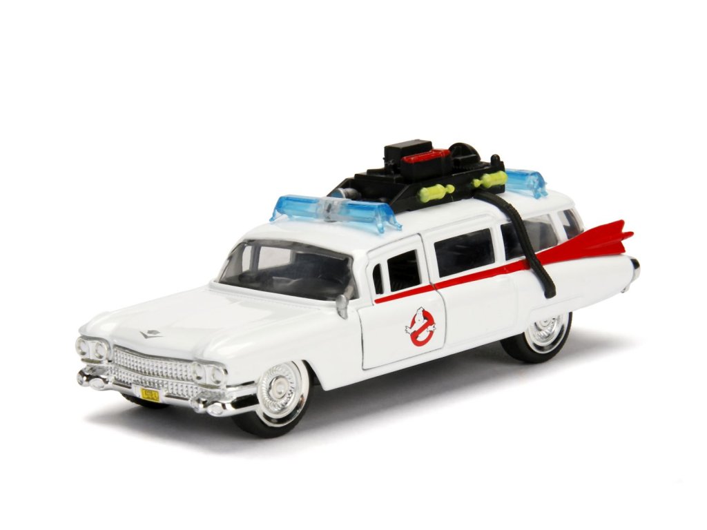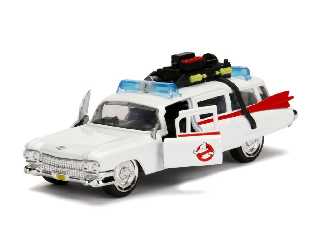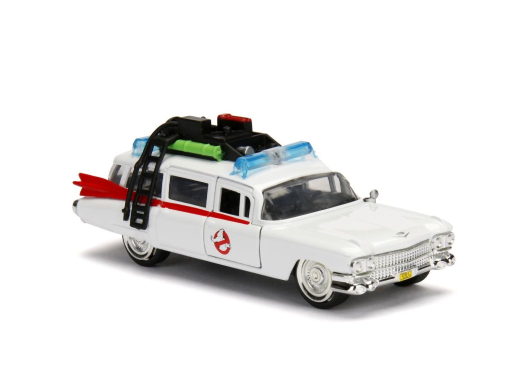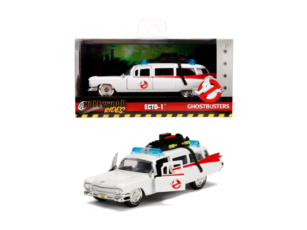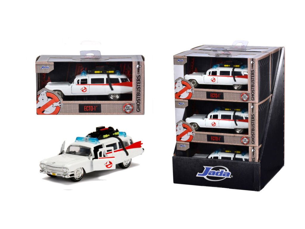 Kovový model auta Gostbusters ECTO-1 v měřítku 1:32 na volnoběh. Otevírací dveře. Velikost 14 cm. Displej obsahuje 6 ks.