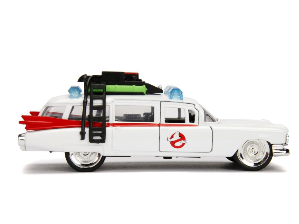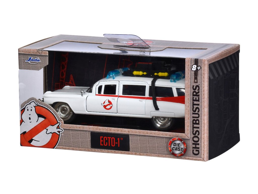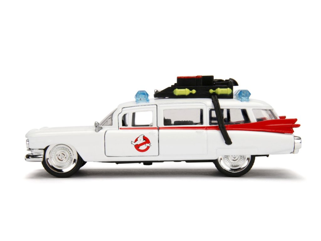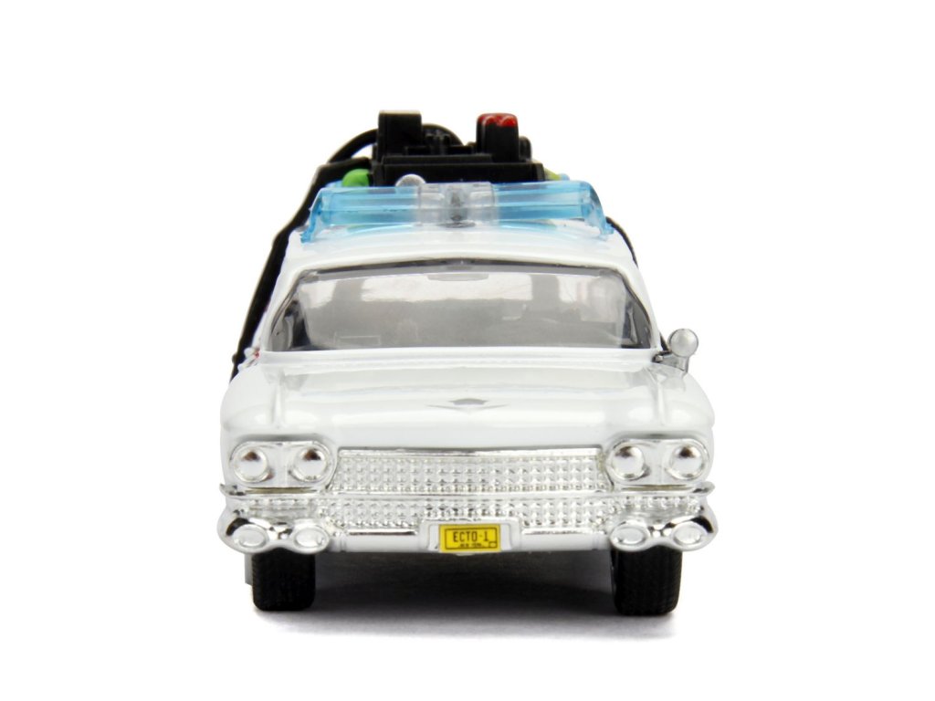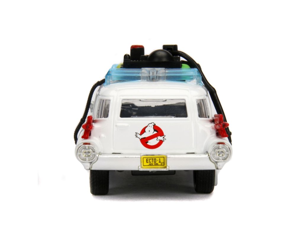 Kovový model auta Gostbusters ECTO-1 v měřítku 1:32 na volnoběh. Otevírací dveře. Velikost 14 cm. Displej obsahuje 6 ks.
