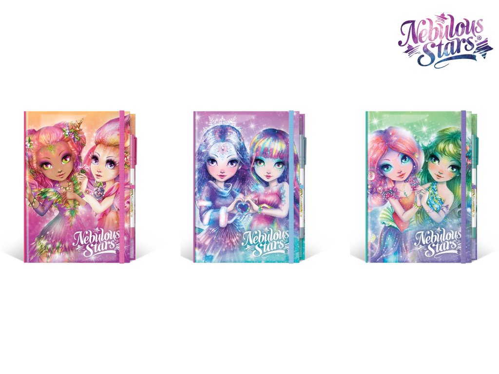 Nebulous Stars deníček. Velikost 20x15 cm. Deníček s bílými stránkami, 96 stran, pero. Display box - 6 ks. 3 varianty - bílá, fialová, růžová.